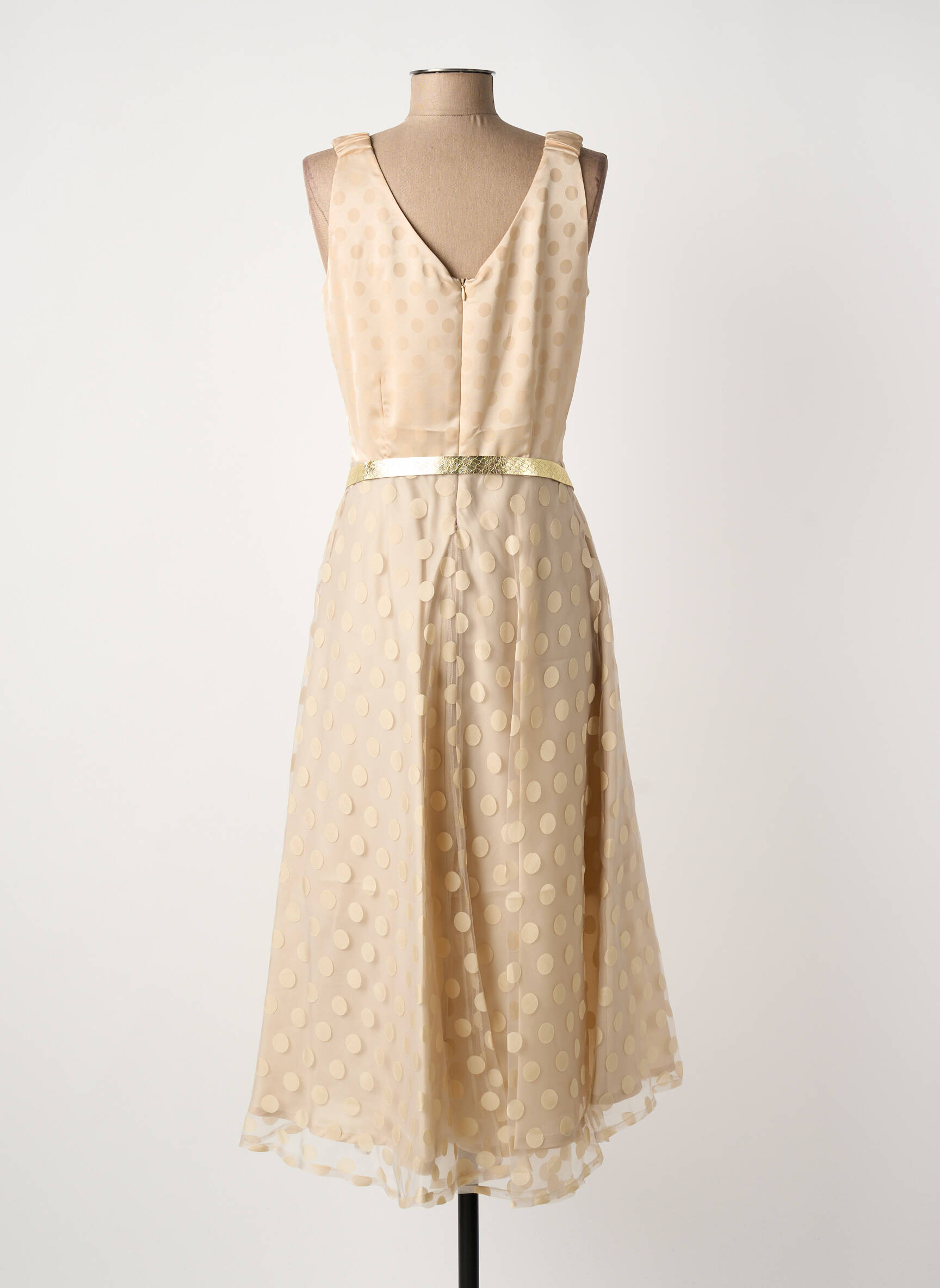 Profitez d’un bon plan irrésistible avec cette robe longue signée PAUL BRIAL, un choix élégant à petit prix pour sublimer vos looks estivaux. Son tissu fluide légèrement transparent, parsemé de pois en relief, offre un tombé aérien très féminin tandis que sa coupe évasée met en valeur la silhouette. Dotée d’un joli décolleté en V et accompagnée d’une fine ceinture dorée qui souligne la taille, elle est idéale pour toutes les occasions où l’on veut allier chic et économies.
