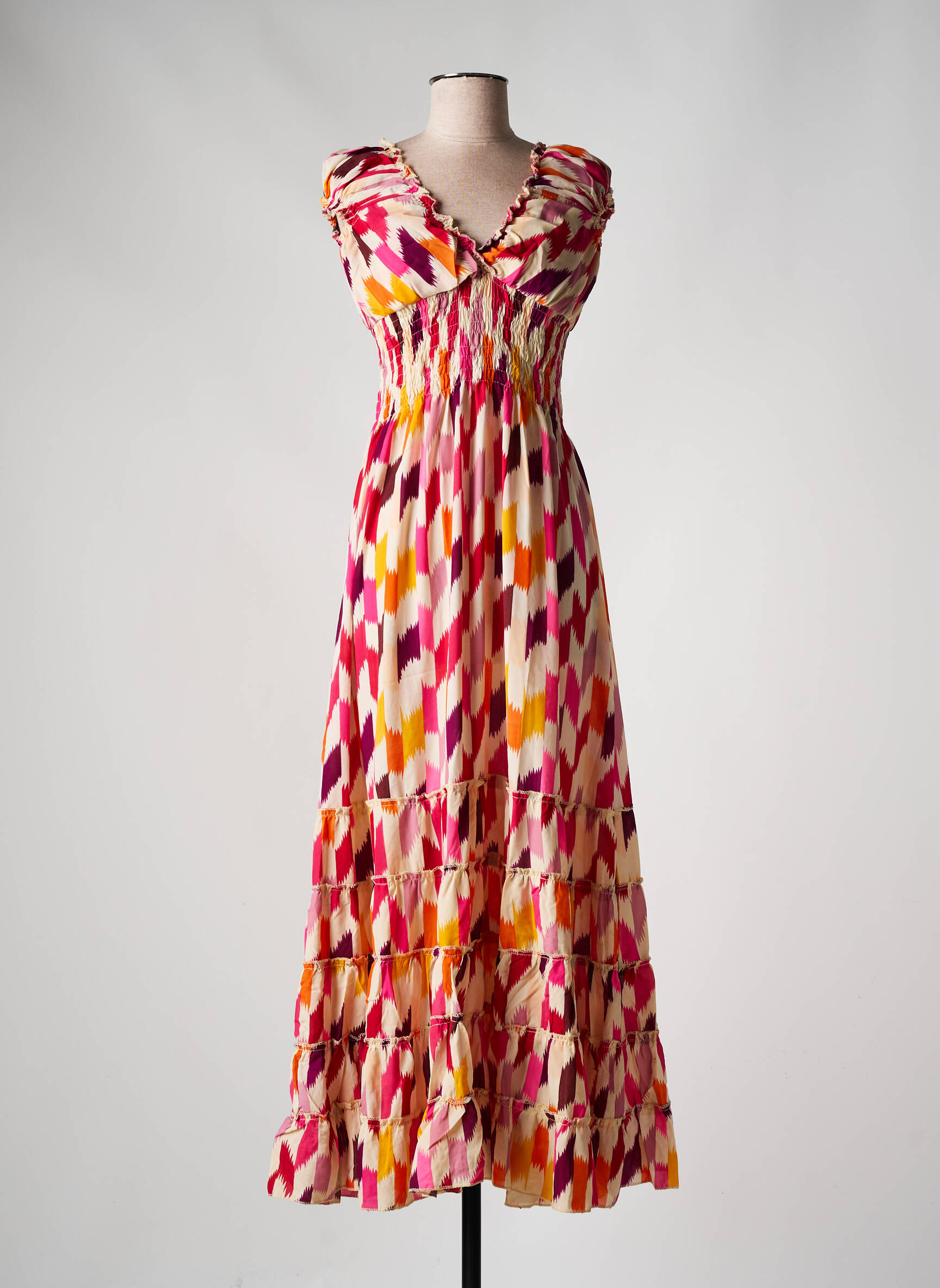 Craquez pour cette robe longue de la marque Pink Planet à prix mini, parfaite pour donner de la couleur à votre dressing sans vous ruiner. Son imprimé géométrique aux teintes vives de rose, orange et écru apporte une touche de fraîcheur, tandis que la coupe fluide et le joli décolleté croisé subliment toutes les silhouettes. Idéale pour profiter des beaux jours ou d’une soirée estivale, cette robe vous assure confort et style tout en faisant de vraies économies.