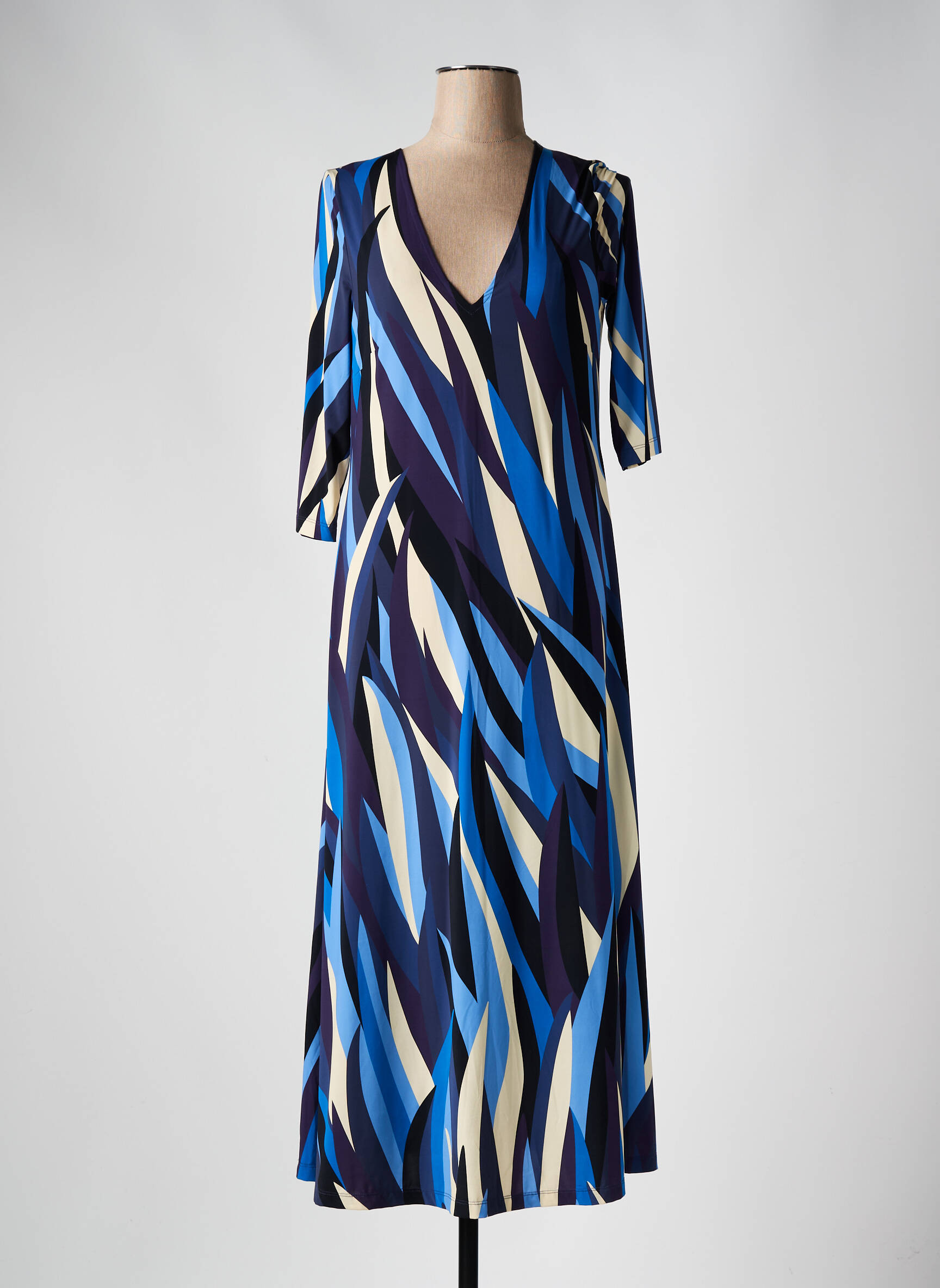 Craquez pour cette robe longue SIYU à prix mini et laissez-vous séduire par son imprimé graphique bleu, noir et crème qui apporte une touche contemporaine à votre tenue. Sa coupe fluide et son joli décolleté en V mettent en valeur la silhouette, tandis que les manches trois-quarts ajoutent une note élégante et facile à porter au quotidien ou pour une soirée. Profitez d’un bon plan et offrez-vous une pièce originale et tendance sans vous ruiner.