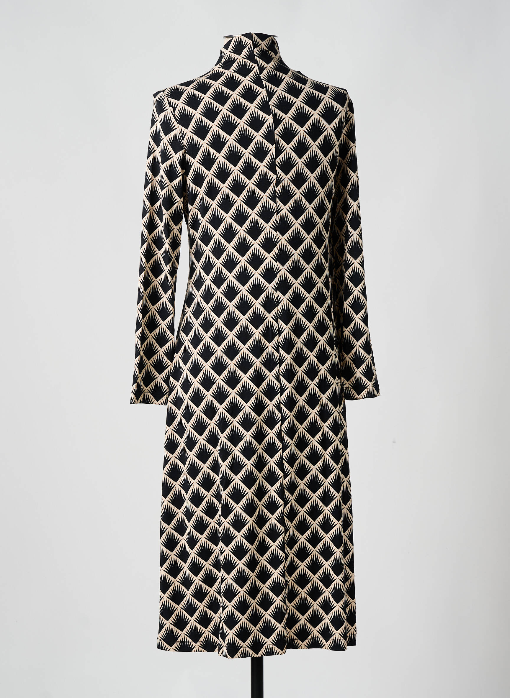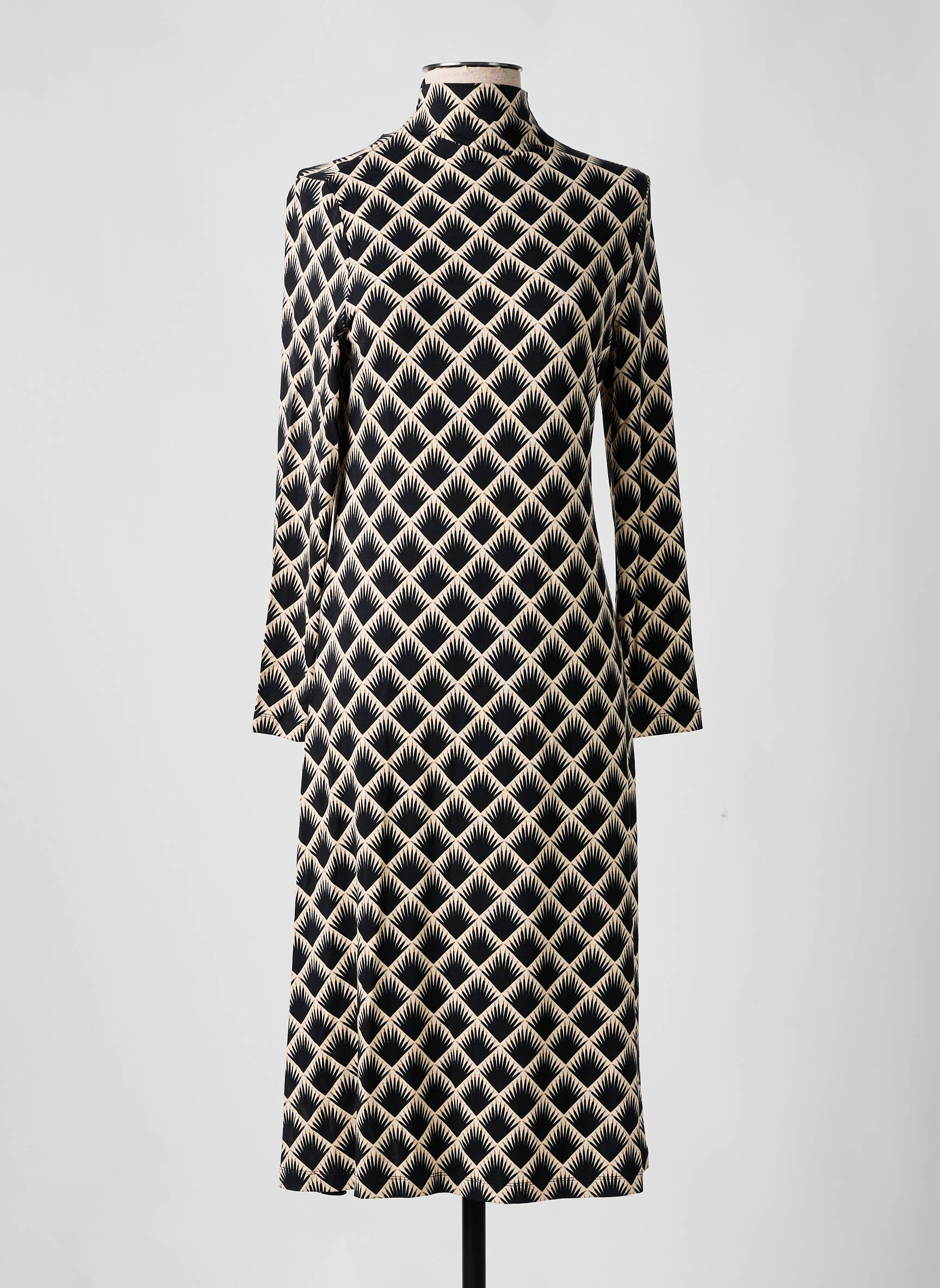 Craquez pour cette robe longue SURKANA pour femme, une véritable opportunité pour ajouter une pièce originale à petit prix à votre garde-robe. Son motif graphique noir et beige attire immédiatement le regard, tandis que sa coupe droite à col montant et manches longues vous assure une allure moderne et élégante. C’est le choix idéal pour se démarquer sans se ruiner et profiter d'un style unique à prix déstockage.