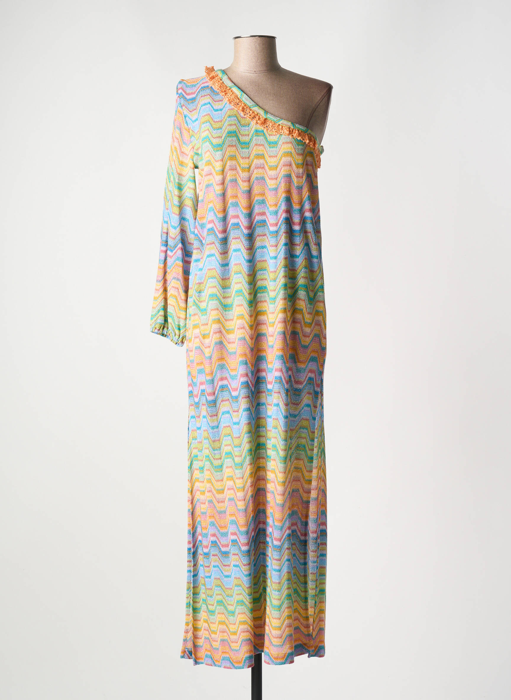 Imaginez-vous capturer l'esprit vibrant d'un coucher de soleil en une seule robe, c'est exactement ce que propose cette longue création signée VALERIE KHALFON. Ce modèle se distingue par sa coupe asymétrique audacieuse avec une épaule dénudée tandis que l’autre reste enveloppée d’une élégante manche longue, offrant une silhouette originale et fluide. La robe déploie une multitude de vagues colorées aux teintes pastel, mêlant subtilement des nuances de bleu, rose, jaune et vert qui évoquent une harmonie joyeuse et raffinée. Sa matière légère laisse deviner un confort aérien qui la rend parfaite pour des occasions où l’on veut marier aisance et sophistication avec une touche artistique unique.