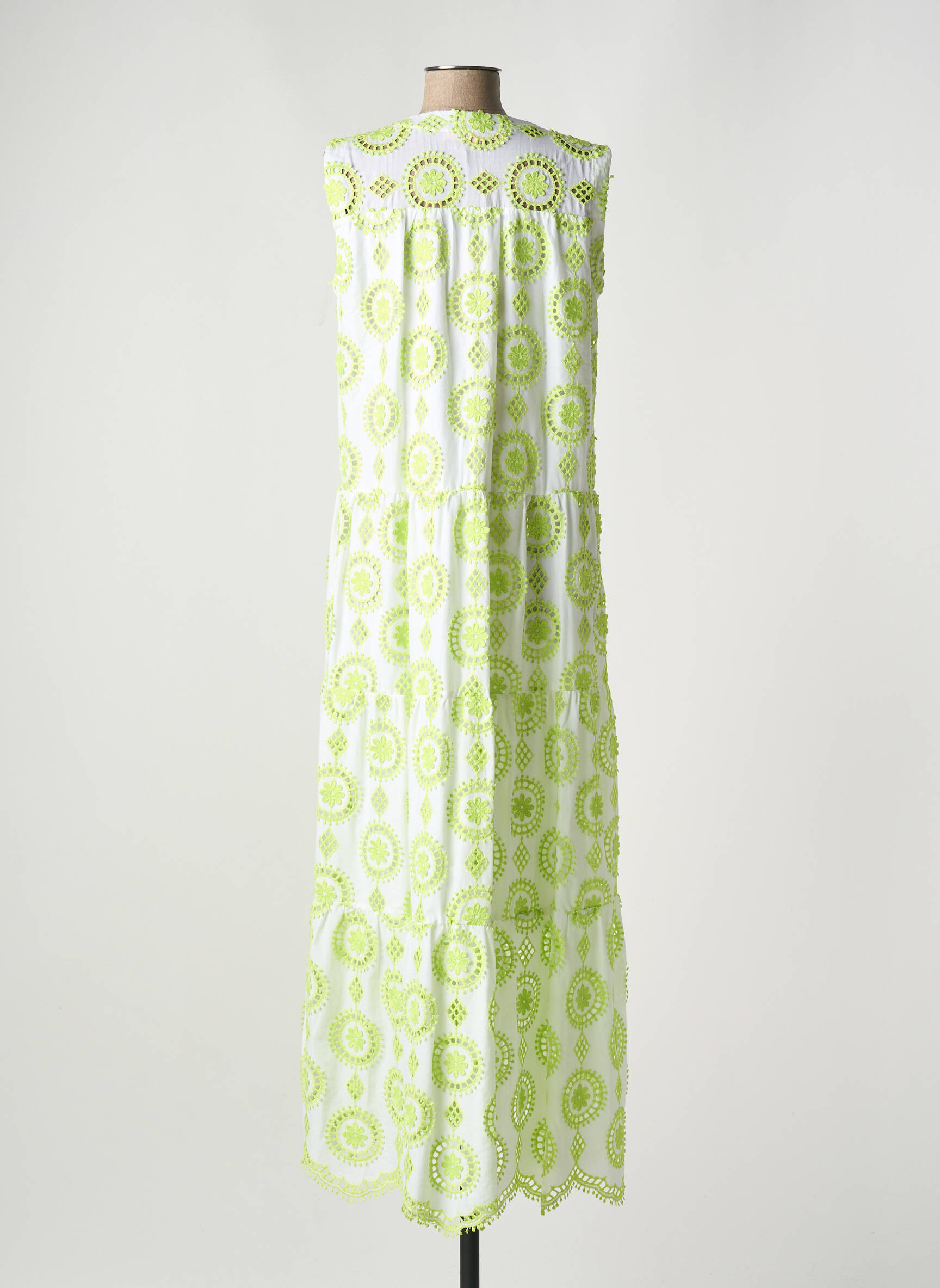 Imaginez une balade estivale où chaque détail de votre robe capte la lumière avec délicatesse : cette robe longue signée VALERIE KHALFON combine une coupe fluide et légère avec un imprimé géométrique aux tons verts et blancs qui évoque fraîcheur et naturel, tandis que son col en V profond et ses épaules larges apportent une élégance décontractée, sublimée par une bordure délicatement festonnée sur toute la base, pour un effet à la fois bohème et raffiné.