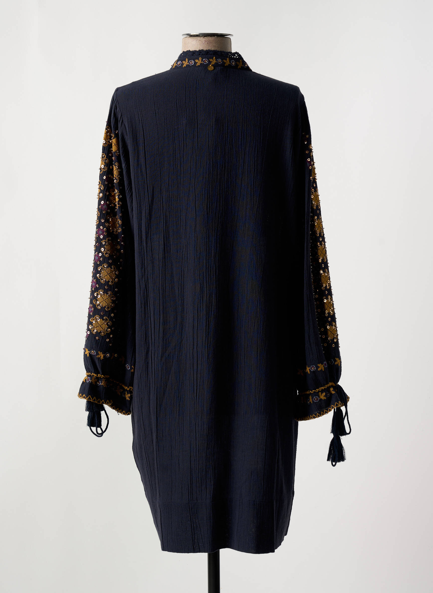 Imaginez un voyage au cœur des traditions revisitées avec subtilité : cette robe mi-longue ANTIK BATIK enveloppe la silhouette d’un noir profond rehaussé d’un délicat patchwork de motifs floraux aux teintes dorées et prune qui habillent le haut du vêtement ainsi que les manches longues, ponctuées de boutons et d'un col montant qui apporte une touche d’élégance intemporelle.