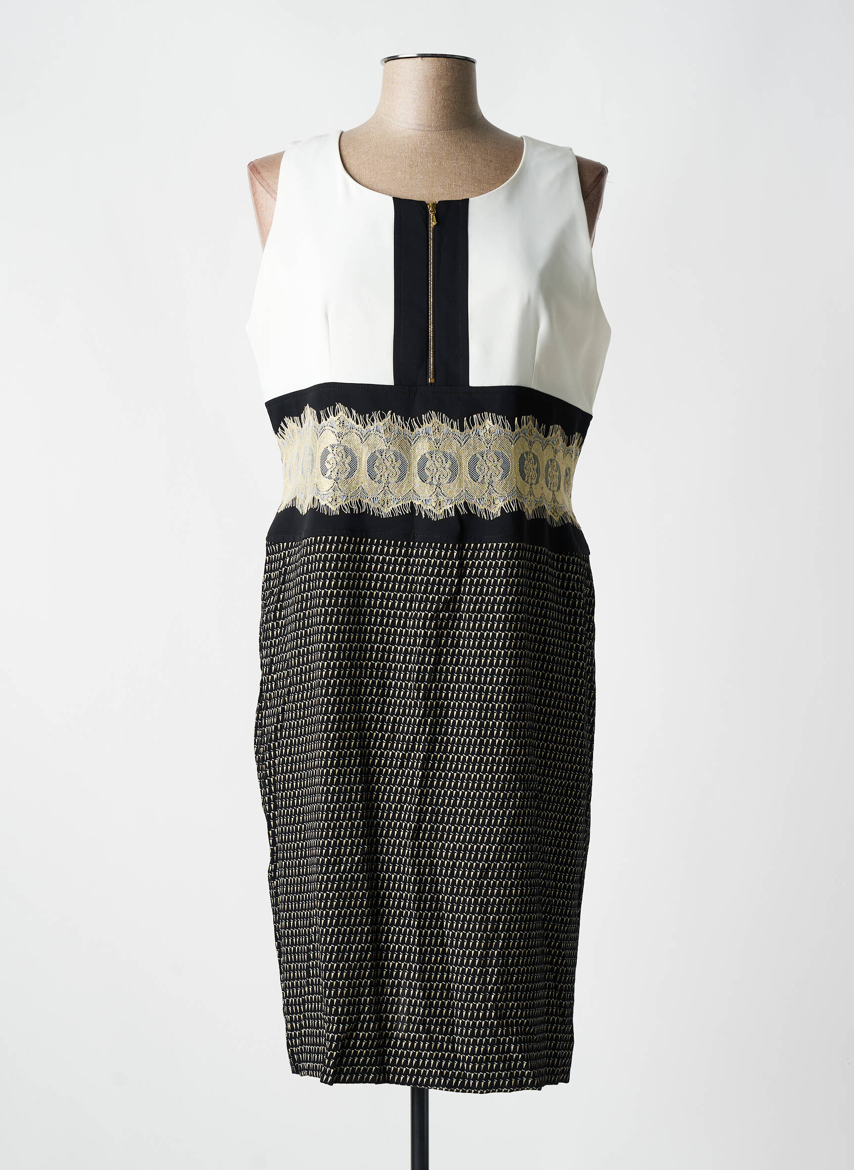 Offrez-vous une robe élégante à prix mini avec cette création mi-longue signée BLEU BLANC ROUGE, un vrai bon plan pour sublimer votre garde-robe sans vous ruiner. Son haut sans manches en blanc contraste joliment avec une bande noire centrale ornée d’un zip et une délicate ceinture brodée de motifs dorés, tandis que le bas noir à motifs apporte une touche sophistiquée et moderne, tout en restant confortable pour toutes vos occasions.