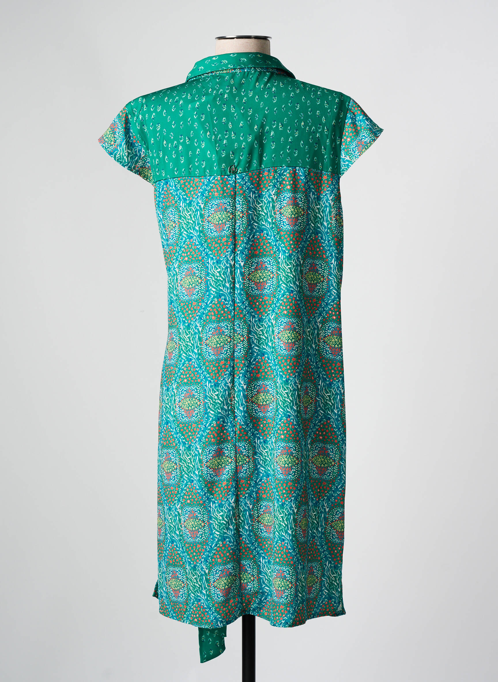 Craquez pour cette robe mi-longue CHATTAWAK à prix mini, un vrai bon plan pour celles qui aiment allier tendance et économies. Avec sa coupe fluide, sa ceinture intégrée et son col chemise, elle offre une silhouette féminine et décontractée, tandis que ses motifs d'inspiration ethnique dans les tons verts et bleu apportent une touche d’originalité à votre dressing. Légère et facile à porter, cette robe est idéale pour profiter des beaux jours sans se ruiner.