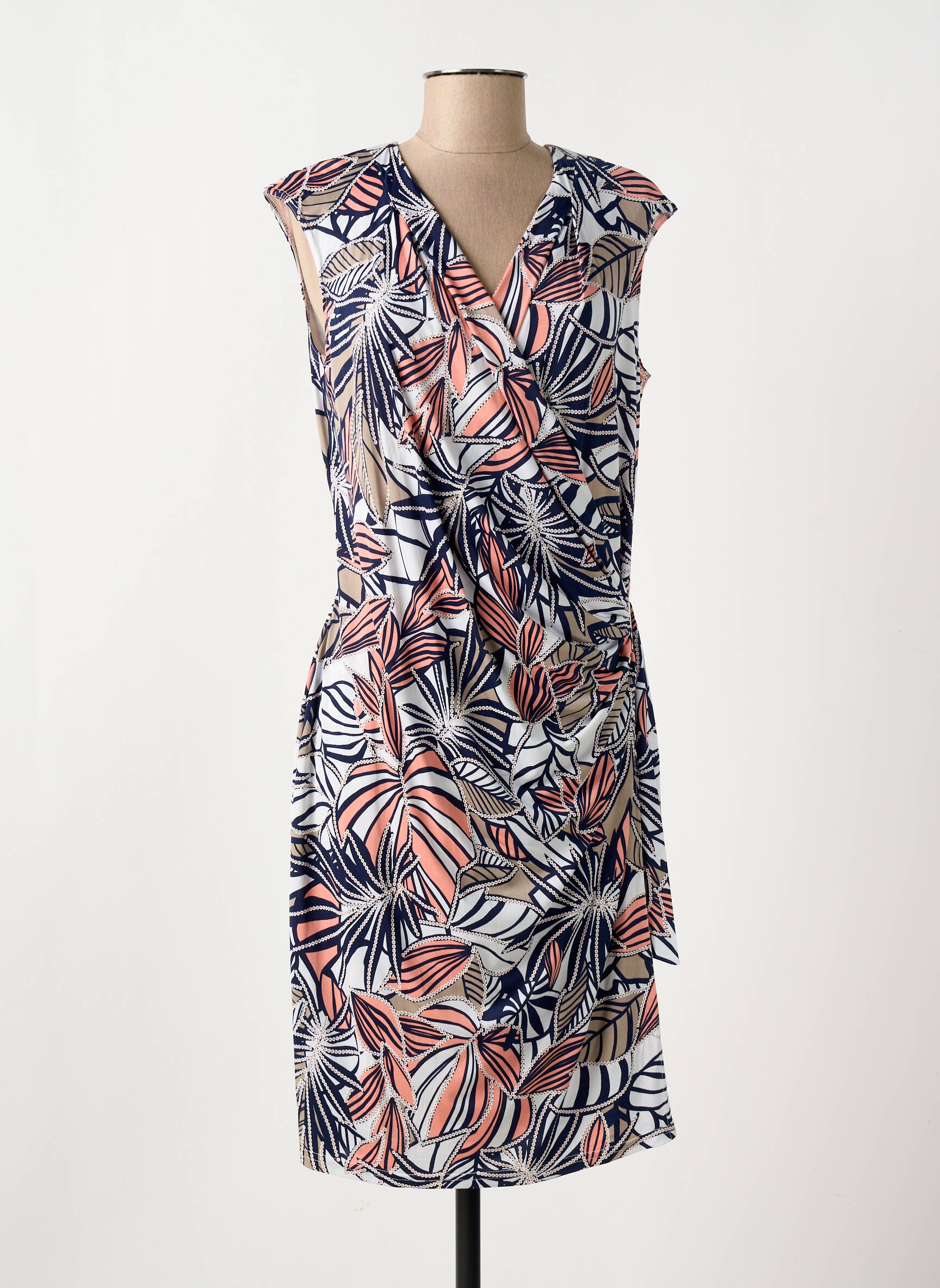 Craquez pour cette robe mi-longue CHRISTINE LAURE à prix irrésistible, idéale pour celles qui veulent se faire plaisir sans se ruiner. Son imprimé feuillage mélange les couleurs bleu marine, corail et blanc pour un look à la fois moderne et frais, tandis que sa coupe cache-cœur féminine met en valeur la silhouette avec élégance et simplicité. Ce modèle polyvalent et tendance est parfait pour toutes les occasions, du bureau aux sorties d’été, tout en profitant d’un bon plan mode sur votre boutique préférée.