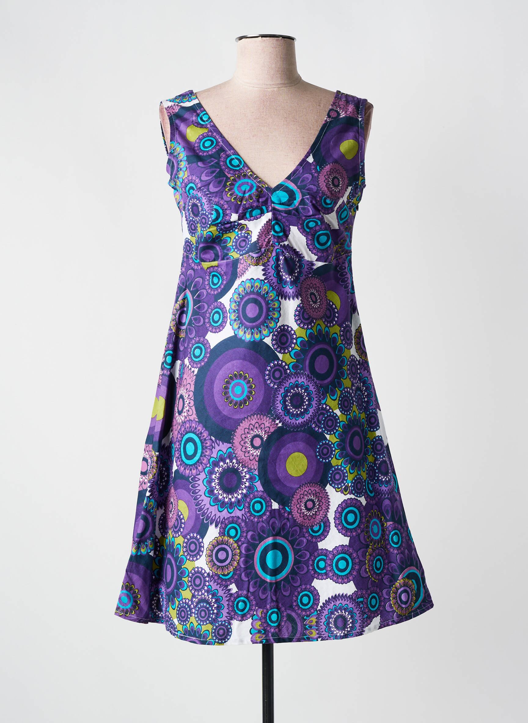 Craquez pour cette robe mi-longue COLINE à prix mini, idéale pour dynamiser votre dressing sans vous ruiner. Son imprimé graphique aux tons violets, bleus et verts apporte une touche originale et moderne, tandis que sa coupe fluide et son décolleté en V offrent un joli tombé féminin et confortable. Profitez de cette pièce colorée et ultra tendance pour faire des économies tout en vous offrant un look plein de pep’s.