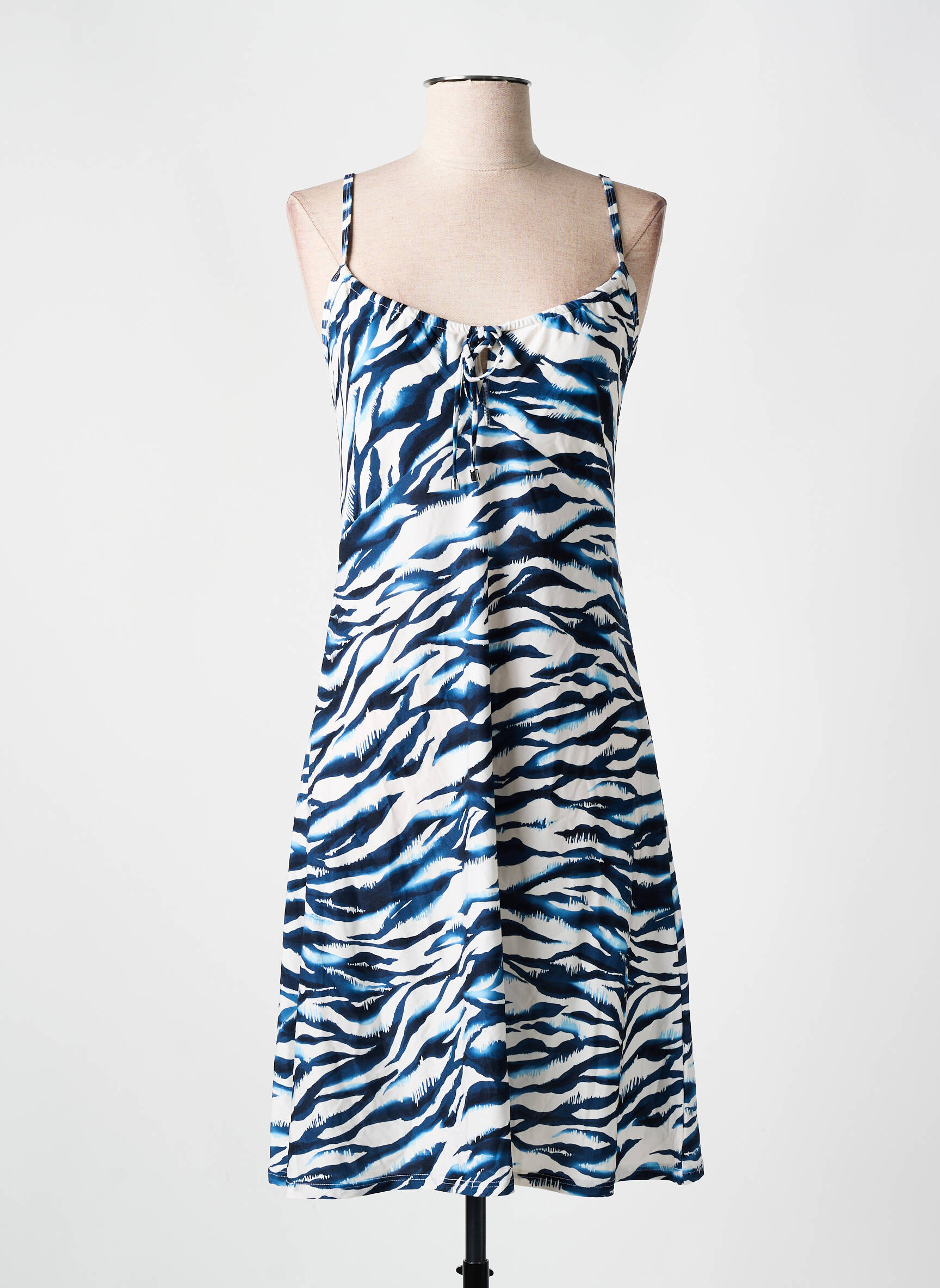 Imaginez-vous glisser dans une robe qui capture l'énergie sauvage et sophistiquée d'une toile d'art abstrait. Cette robe mi-longue CYELL pour femme dévoile un éclat dynamique avec son imprimé zébré bleu, noir et blanc, où les lignes fluides épousent délicatement la silhouette grâce à ses fines bretelles ajustables et son léger froncé au niveau du buste, offrant à la fois confort et charme.