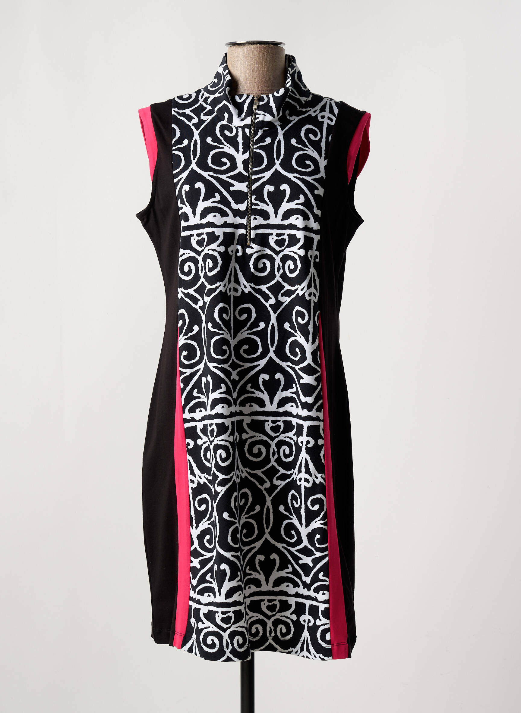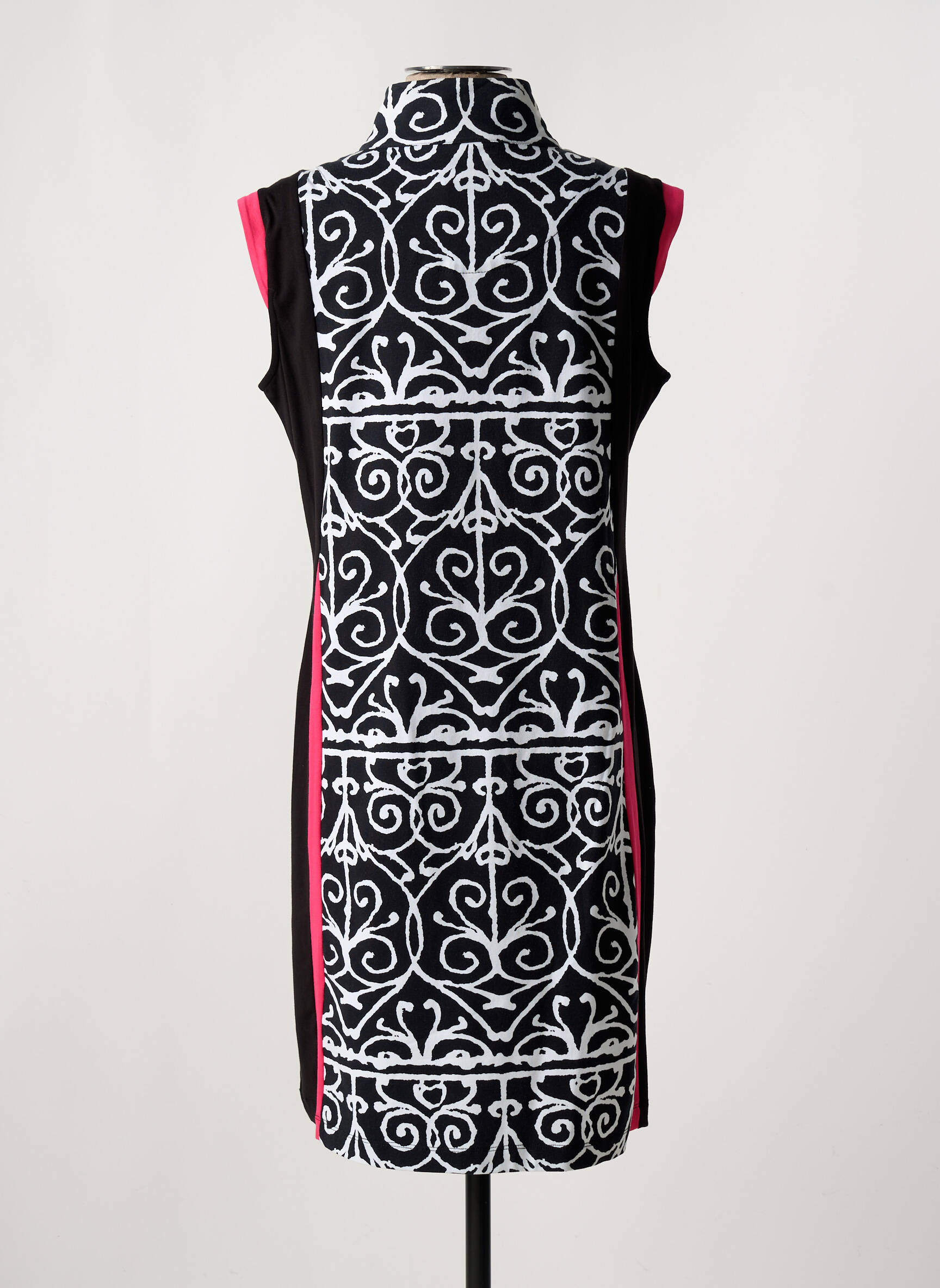 Craquez pour cette robe mi-longue DOLCEZZA à prix tout doux, parfaite pour ajouter une touche d’originalité à votre garde-robe sans vous ruiner. Son imprimé graphique noir et blanc souligne une silhouette élégante, tandis que les empiècements noirs et les touches de fuchsia sur les côtés apportent une note dynamique et féminine. Idéale pour celles qui recherchent un vêtement chic et tendance à prix mini, cette robe sans manches saura vous séduire par son design moderne et son allure sophistiquée.
