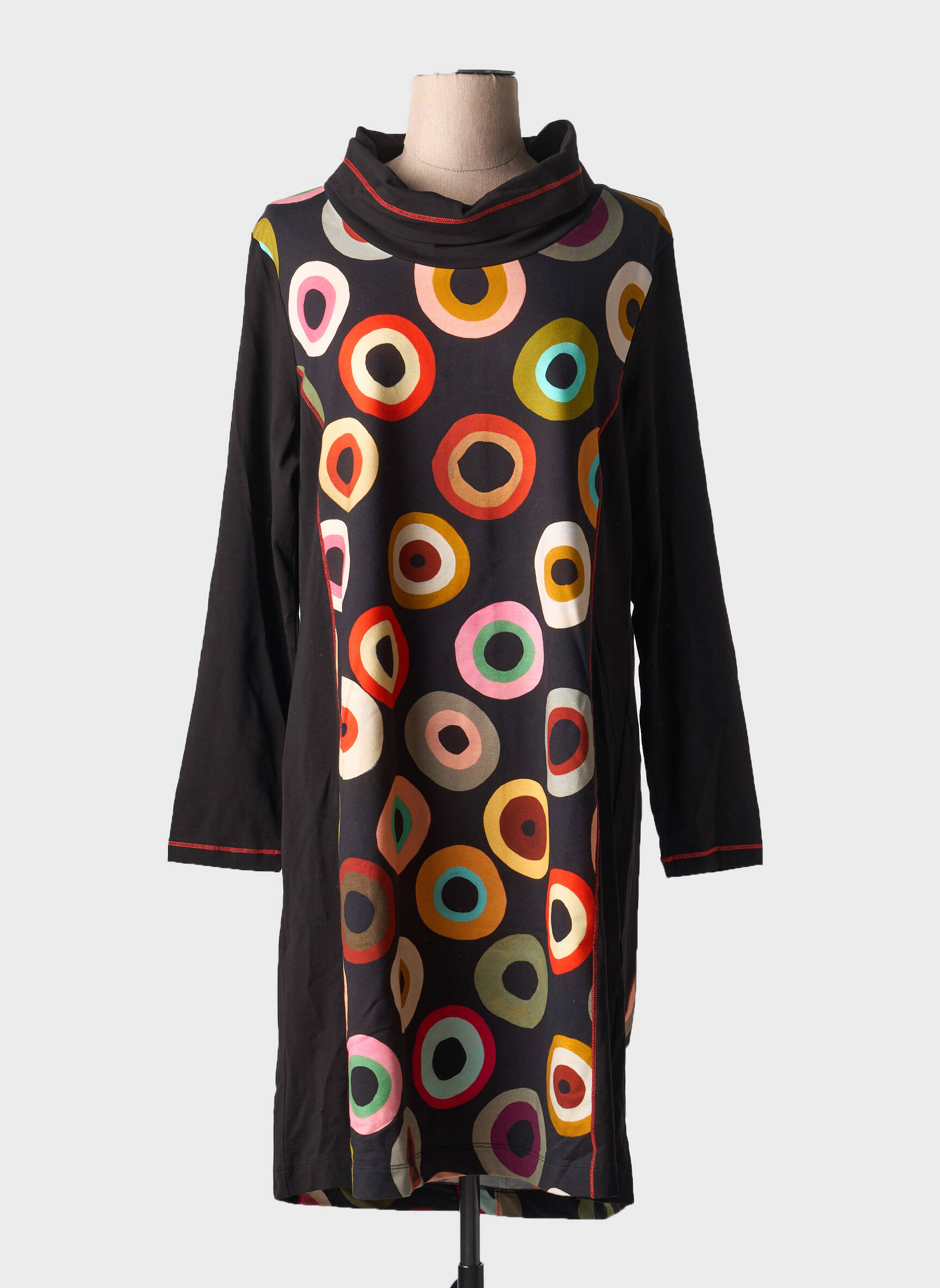 Profitez d’un bon plan mode avec cette robe mi-longue Dolcezza au design unique qui ne passera pas inaperçu, idéale pour ajouter une touche d’originalité à votre dressing à petit prix. Sur un fond noir élégant, ses motifs cerclés multicolores apportent du dynamisme et de la fantaisie, tandis que sa coupe droite et son col légèrement drapé assurent un tomber flatteur et confortable pour toutes les occasions. Ne ratez pas cette occasion de vous offrir une pièce tendance sans vous ruiner.