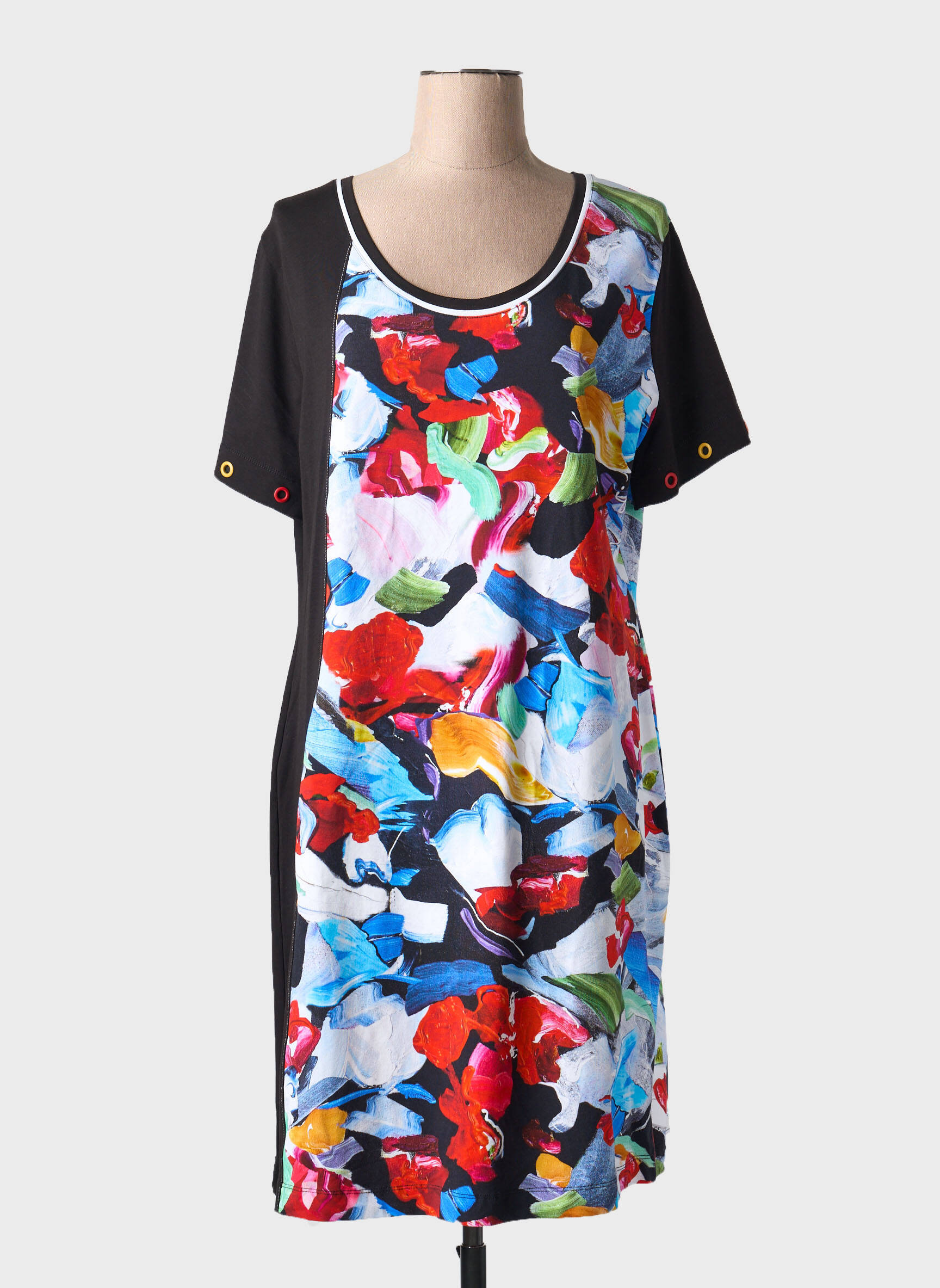 Craquez pour cette robe mi-longue Dolcezza pour femme à prix irrésistible, idéale pour ajouter une touche artistique et colorée à votre garde-robe sans vous ruiner. Sa coupe flatteuse met en valeur une magnifique impression abstraite multicolore sur le devant, contrastée par des empiècements noirs sur les côtés et les manches courtes pour une silhouette dynamique et moderne. Profitez d’un bon plan mode tout en apportant originalité et élégance à votre quotidien.