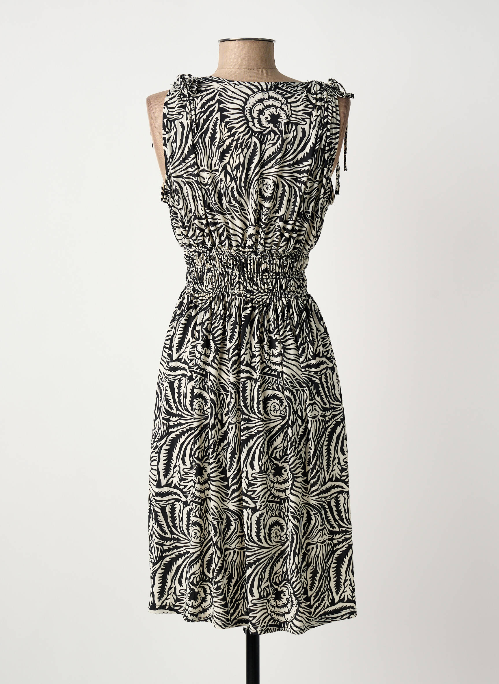 Saisissez l’occasion de craquer pour cette robe mi-longue ELENA Z pour femme à prix tout doux, idéale pour renouveler votre dressing sans vous ruiner. Avec son imprimé noir et blanc au motif feuillage raffiné, son encolure en V élégante et sa taille smockée qui met en valeur la silhouette, cette pièce légère et féminine allie confort et style pour toutes vos envies de looks estivaux. Voilà l’alternative parfaite pour profiter d’une robe tendance à prix malin.