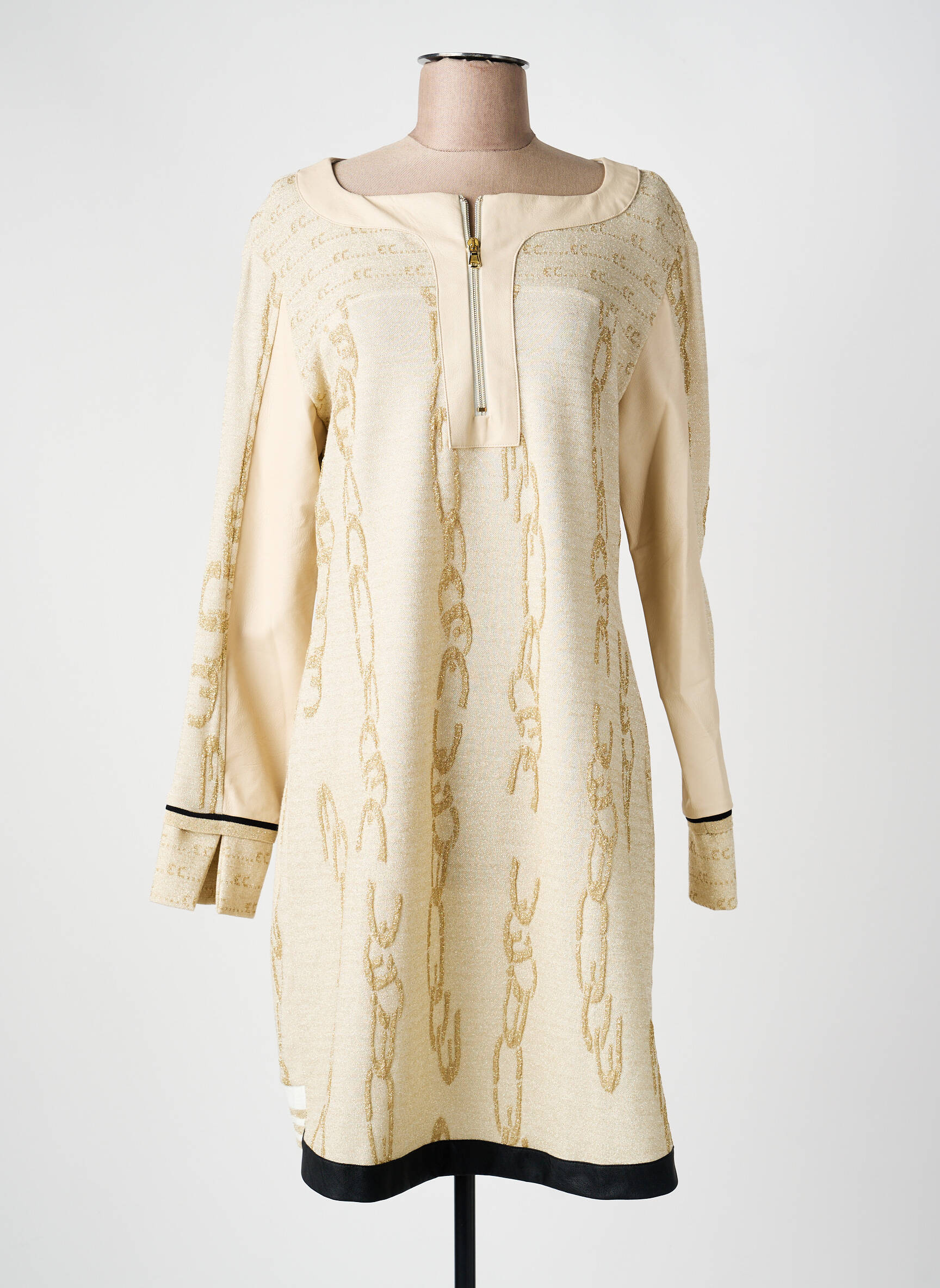 Profitez d'un bon plan avec cette robe mi-longue Elisa Cavaletti pour femme qui allie élégance et originalité à prix mini. Sa teinte crème sublimée de motifs dorés façon chaîne apporte une touche chic et contemporaine, tandis que le détail du col zippé et la finition noire contrastante sur le bas et les poignets assurent une allure raffinée et moderne. Offrez-vous un look de créatrice sans vous ruiner grâce à cette pièce unique parfaite pour toutes les occasions.