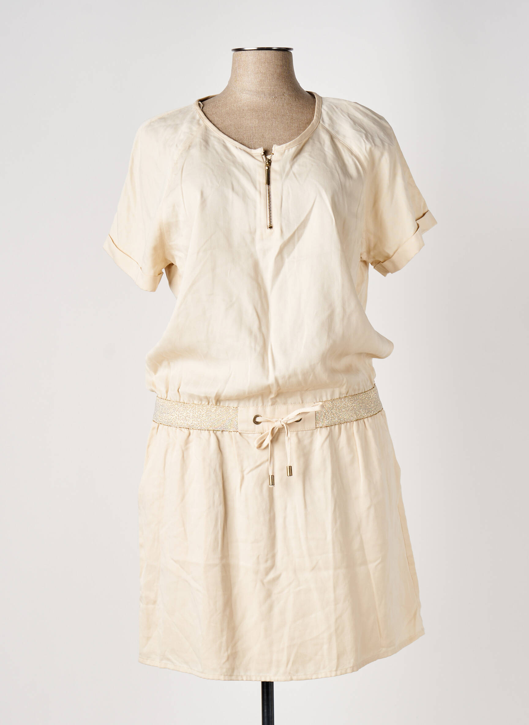 Imaginez une tenue qui capture la douceur d'un souffle estival avec une simplicité élégante ; cette robe mi-longue ELORA pour femme séduit par son tissu fluide couleur écru, ses manches courtes retroussées qui apportent une touche décontractée et son col rond agrémenté d’une courte fermeture éclair discrète. La taille marquée par un cordon ajustable souligne la silhouette avec légèreté tandis que la coupe droite épouse naturellement le corps, offrant un équilibre parfait entre confort et raffinement.