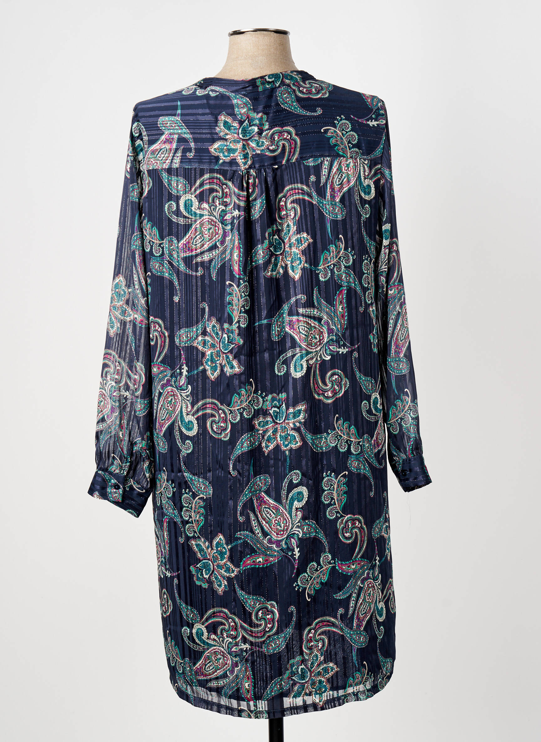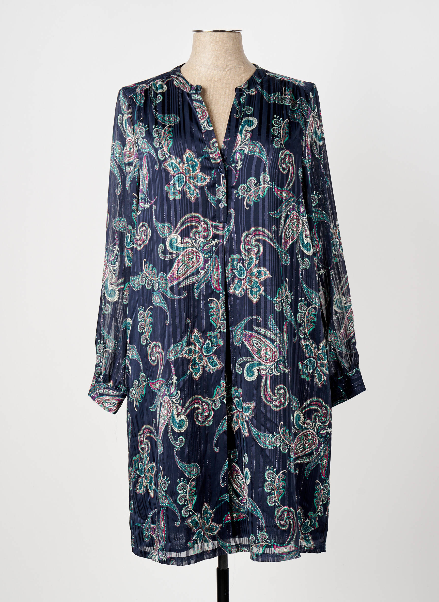 Si la poésie avait une forme vestimentaire, ce serait sans doute cette robe mi-longue ELORA pour femme qui se distingue par son imprimé cachemire délicatement coloré sur un fond bleu profond. Sa coupe fluide et légèrement évasée, rehaussée par un col en V discret et de longues manches, offre une élégance naturelle et un confort idéal pour vos journées comme pour vos soirées.