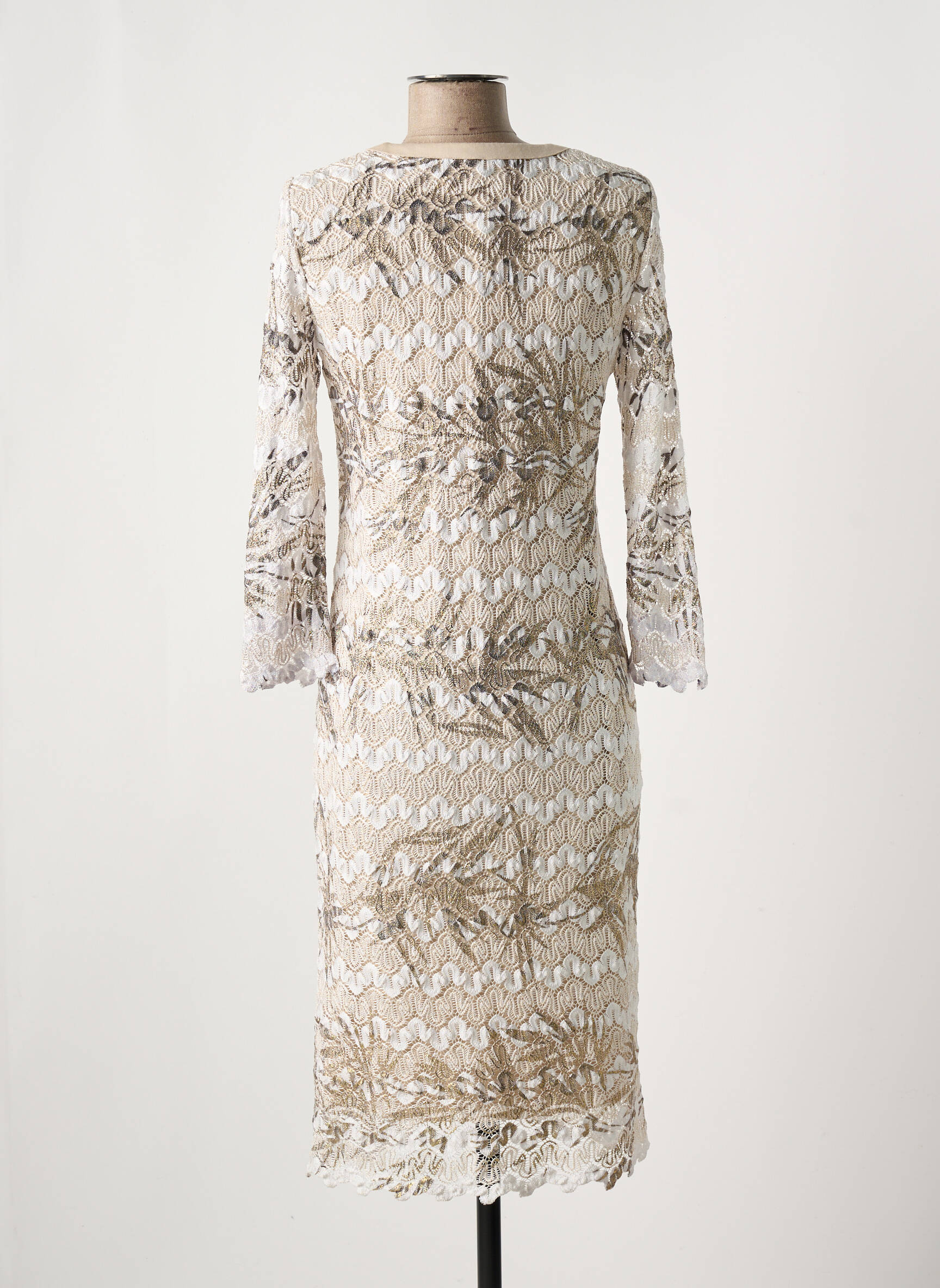 Profitez d’une occasion unique de vous offrir une robe mi-longue EUGEN KLEIN à prix mini avec cette pièce élégante qui conjugue raffinement et belle économie. Cette robe pour femme séduit par sa coupe droite et son jeu de transparence délicate grâce à sa superposition de dentelle, tandis que ses motifs floraux beiges et dorés apportent une touche chic et lumineuse. Le décolleté subtil et les manches longues accentuent l’allure féminine, idéale pour une tenue habillée sans se ruiner.