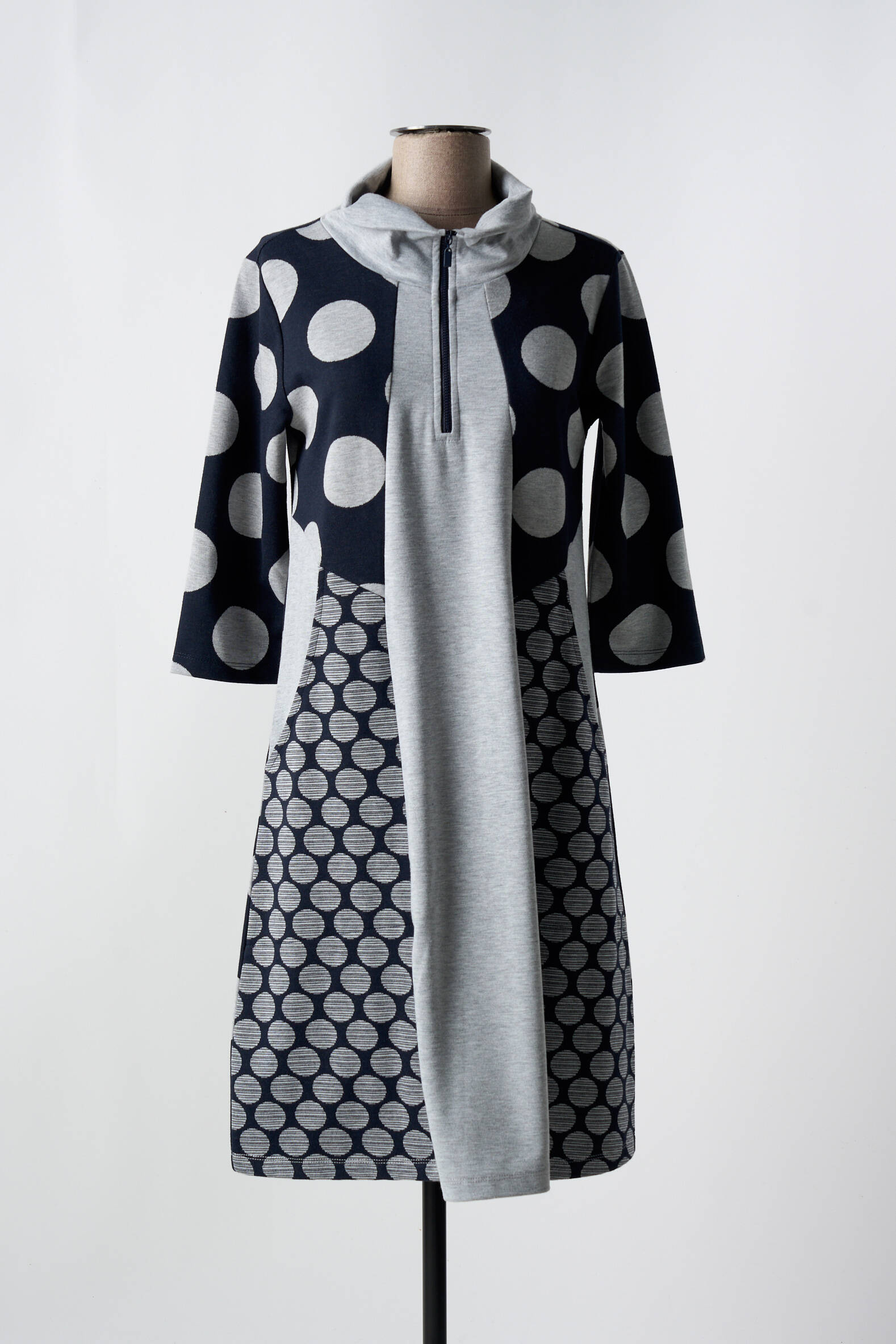 Osez le charme décalé avec cette robe mi-longue EVER SASSY qui joue audacieusement sur les contrastes et les textures. Le design mêle un jeu de pois oversize sur les manches et le haut du corps à un motif plus serré, géométrique, sur le bas, tandis qu’une large bande grise centrale vient structurer l’ensemble en toute modernité. Son col montant avec demi-fermeture zippée ajoute une touche sportive et pratique qui dynamise cette création originale, parfaite pour afficher une allure à la fois tendance et décontractée.