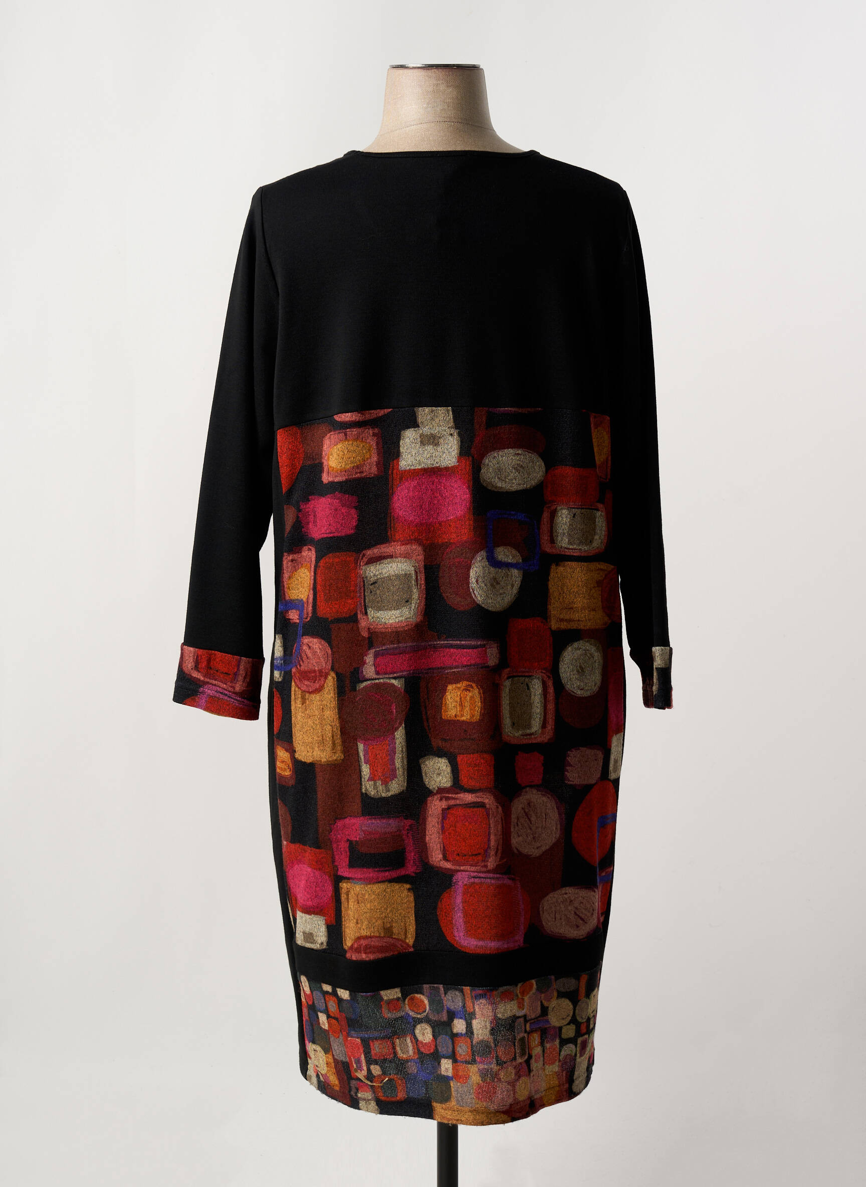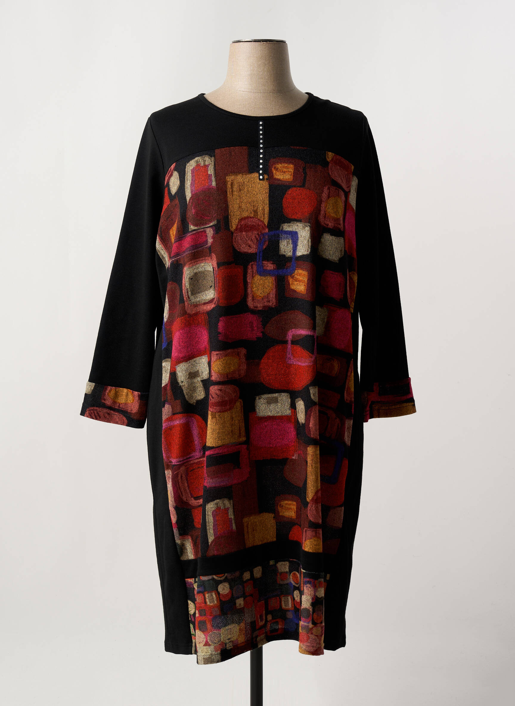 Profitez d’une belle opportunité pour vous offrir cette robe mi-longue de la marque FRANCE RIVOIRE, idéale pour celles qui recherchent style et petits prix. Avec son imprimé graphique audacieux aux accents rouges, ocres et violets, elle attire le regard tout en restant facile à porter au quotidien. La coupe droite et confortable, rehaussée de manches longues et d’un détail bouton sur le col, en fait une pièce parfaite pour sublimer votre silhouette sans effort. C’est le bon plan à saisir pour ajouter une touche originale et élégante à votre dressing sans faire flamber votre budget.