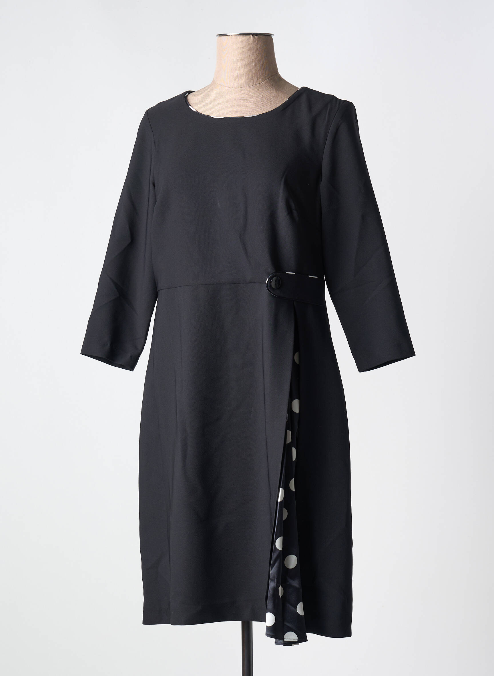 Craquez pour cette robe mi-longue de la marque France Rivoire, une pièce élégante à prix tout doux pour sublimer votre garde-robe sans vous ruiner. Son tissu noir sobre et raffiné est réveillé par un joli détail de pan asymétrique à pois, qui apporte une touche d’originalité discrète. Les manches longues et l’encolure ronde garantissent un look chic en toute simplicité, idéal pour passer du bureau à une soirée avec style, tout en profitant d’un bon plan mode irrésistible.
