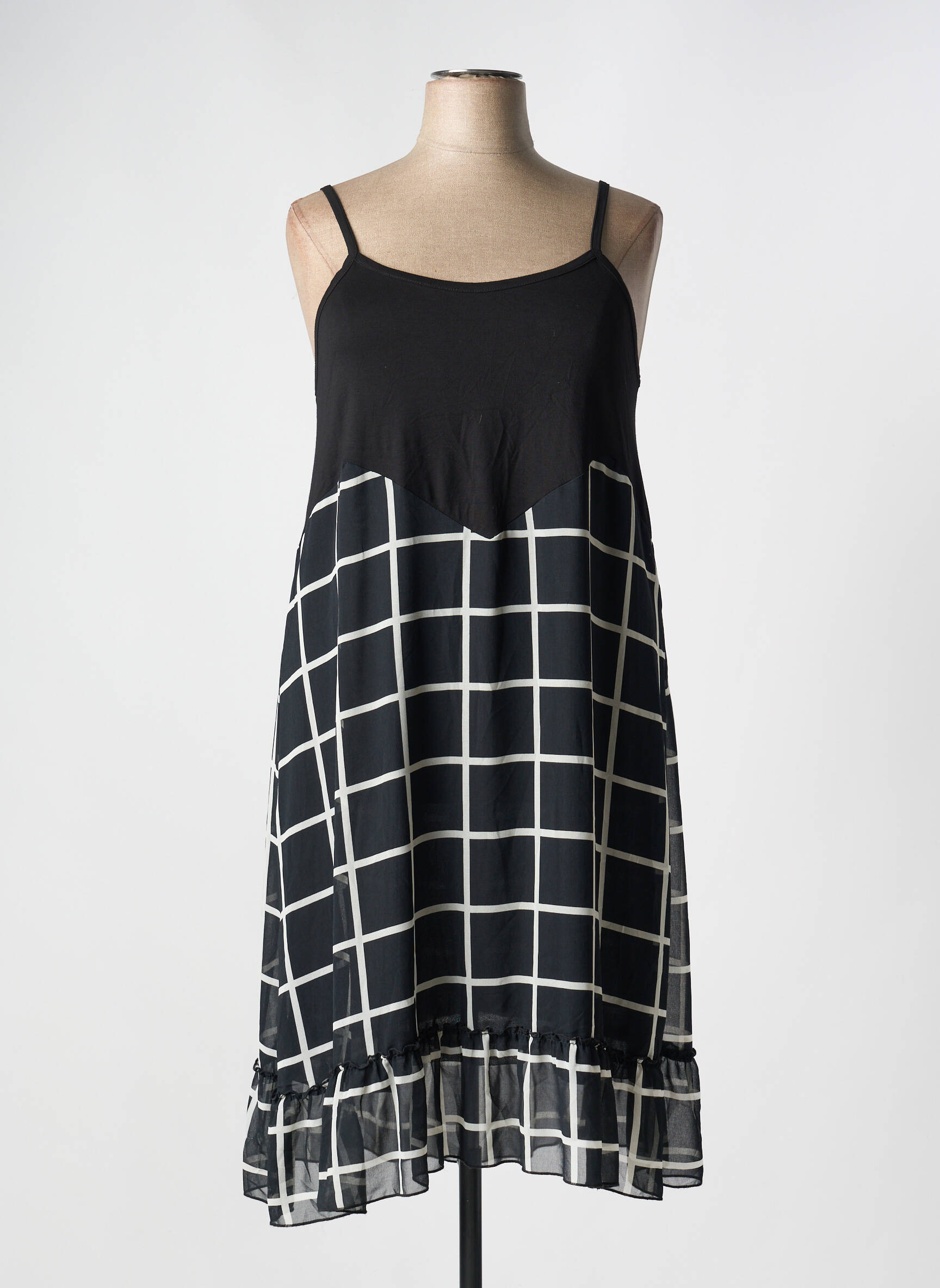 Craquez pour cette robe mi-longue de la marque G!OZE, une véritable opportunité à petit prix pour apporter une touche graphique et moderne à votre dressing. Son haut uni noir se marie parfaitement à une jupe évasée ornée d’un large motif à carreaux blancs, créant un contraste tendance, tandis que les fines bretelles et la finition volantée en bas offrent une allure féminine et légère. Profitez d’un style chic sans vous ruiner grâce à ce bon plan incontournable.