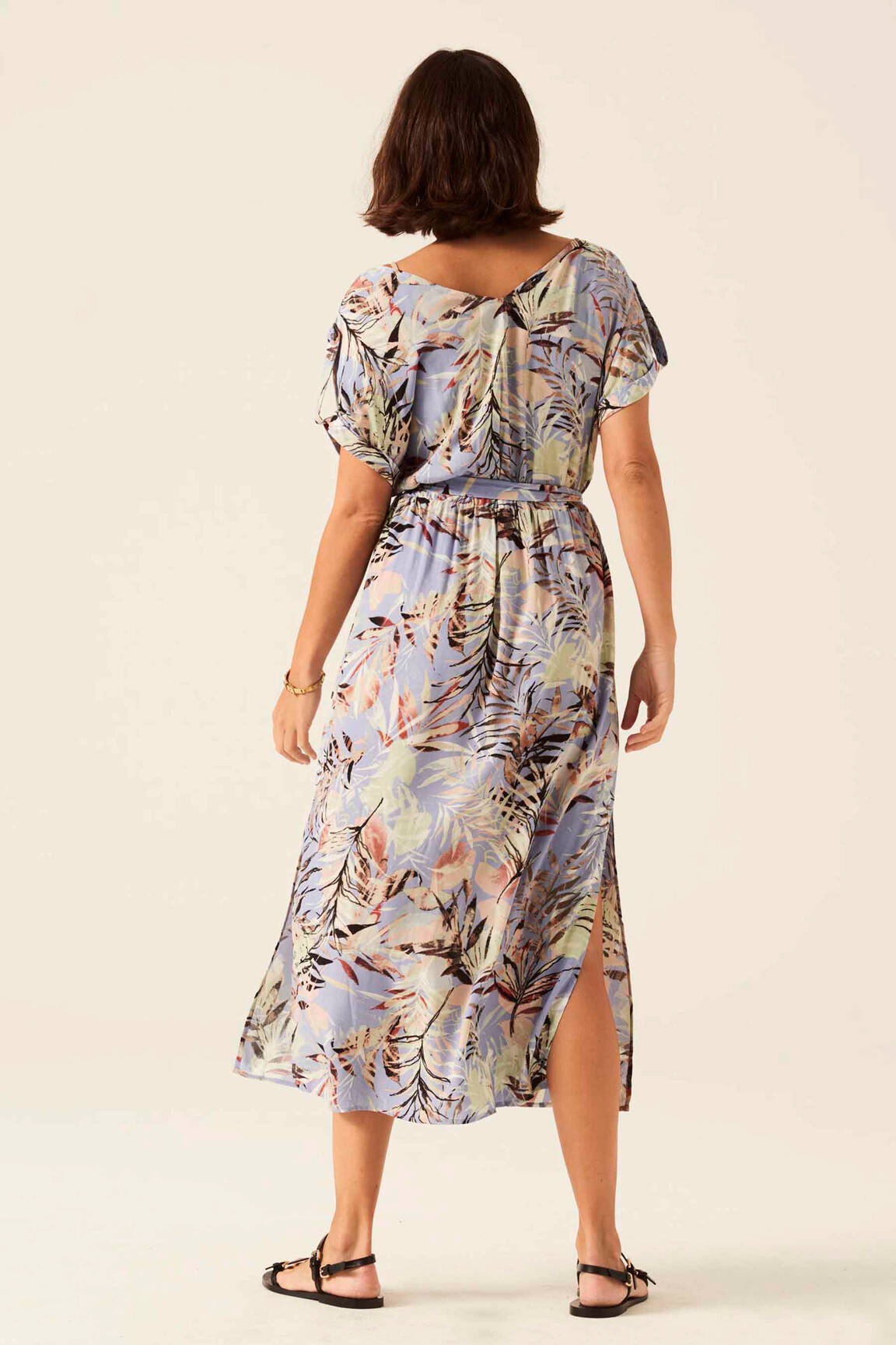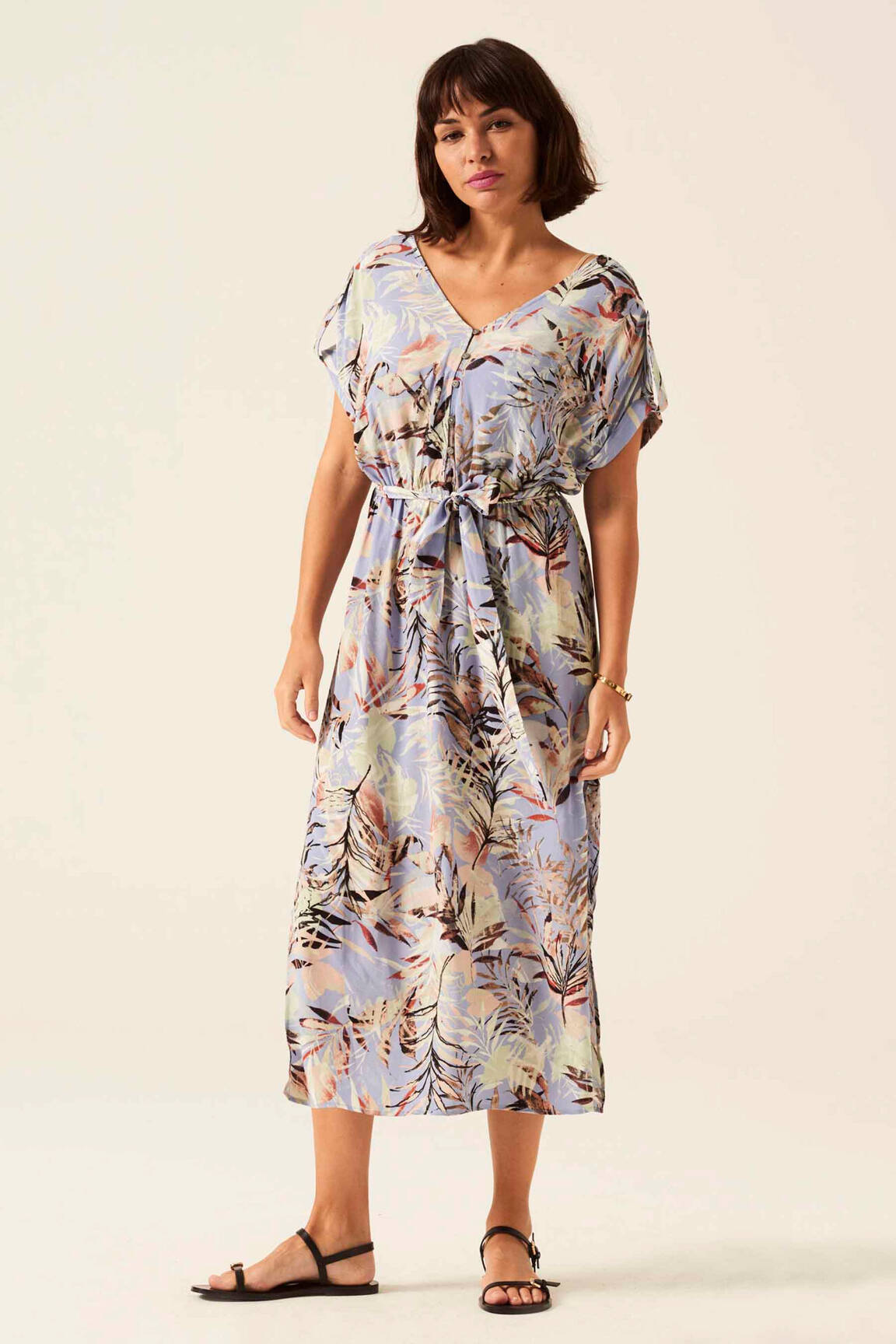 Si le printemps avait une robe, ce serait sans doute celle-ci, signée Garcia. Cette robe mi-longue dévoile un imprimé floral délicat aux teintes douces et pastel, posé sur un fond bleu ciel qui évoque une brise légère d’été. Sa silhouette fluide est soulignée à la taille par une fine ceinture, tandis que son col en V apporte une touche d’élégance et de féminité. Les manches courtes sont travaillées avec un subtil effet drapé, offrant à l’ensemble une allure à la fois décontractée et sophistiquée, parfaite pour accompagner vos journées ensoleillées avec légèreté et style.