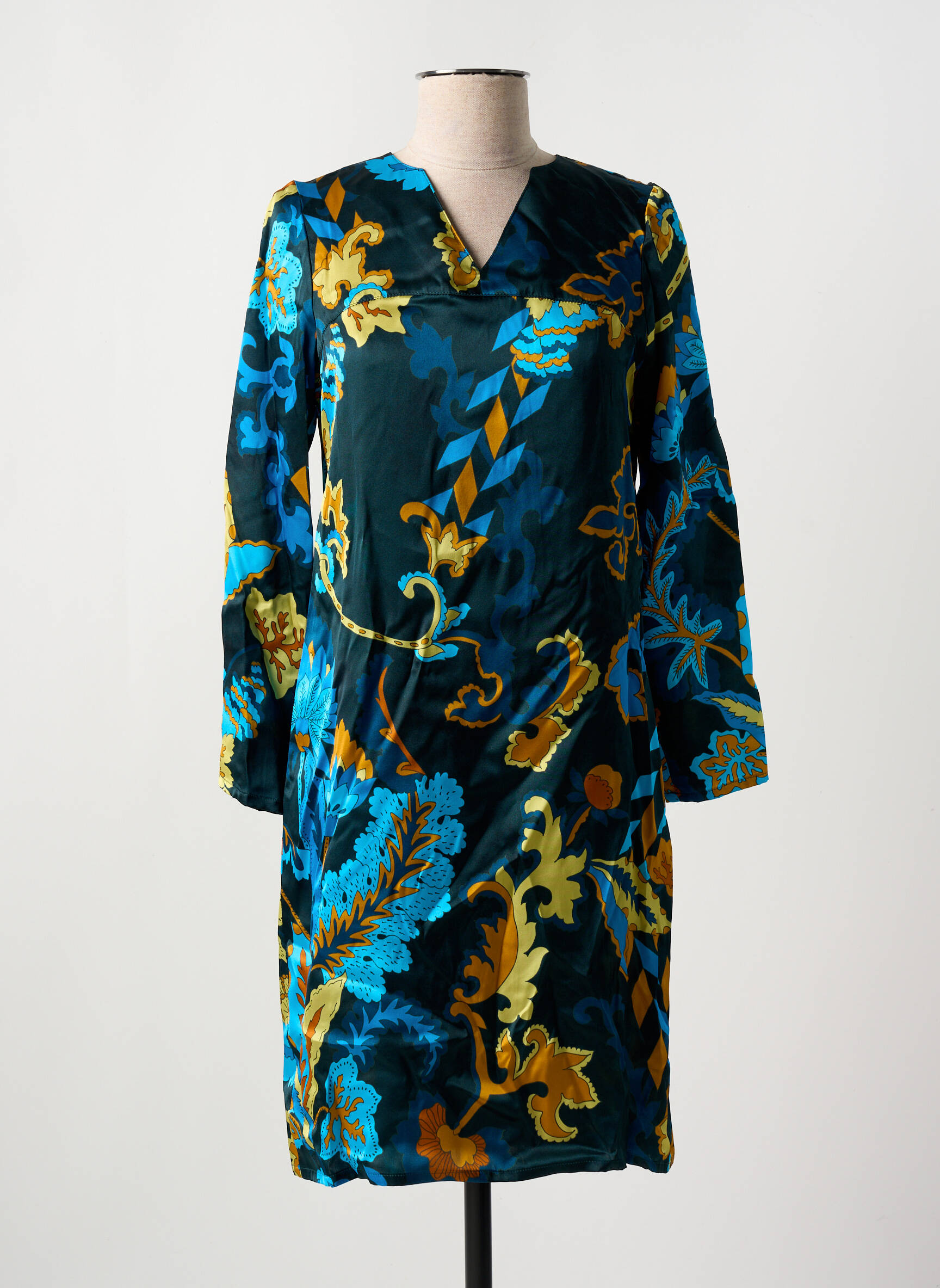 Profitez d’un véritable bon plan avec cette robe mi-longue de la marque GREGORY PAT, idéale pour ajouter une touche d’originalité à votre garde-robe sans vous ruiner. Son tissu fluide et agréable met en valeur un imprimé floral et graphique aux couleurs vibrantes, qui fait toute la différence pour un look plein de caractère. Sa coupe droite et son col fendu apportent une élégance naturelle tout en garantissant un confort optimal au quotidien, à un prix mini.