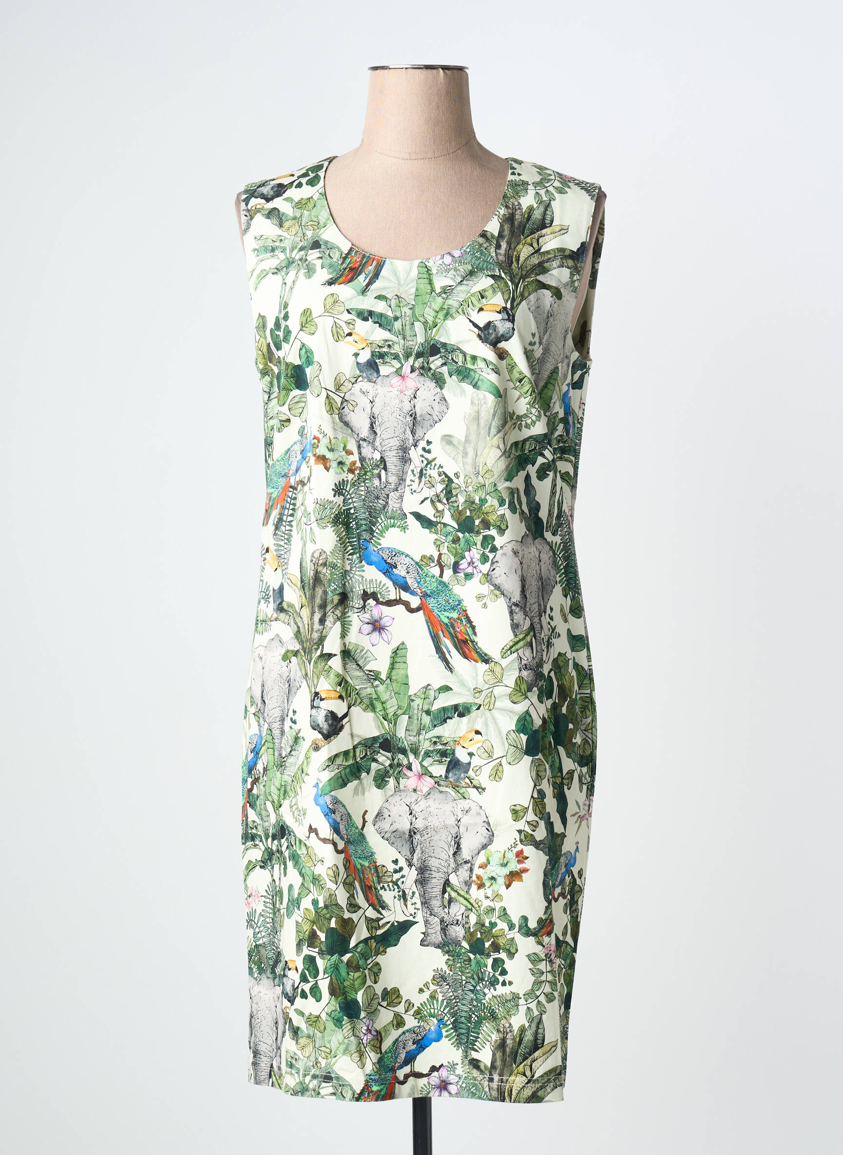 Saisissez l’opportunité de vous offrir une robe mi-longue griffée GRIFFON à prix mini, avec ce modèle sans manches qui séduit par son imprimé exotique mêlant éléphants, perroquets et feuillage luxuriant sur un fond clair. Sa coupe droite et son encolure ronde vous garantissent un look frais et original, parfait pour insuffler une note de fantaisie à votre dressing sans vous ruiner.