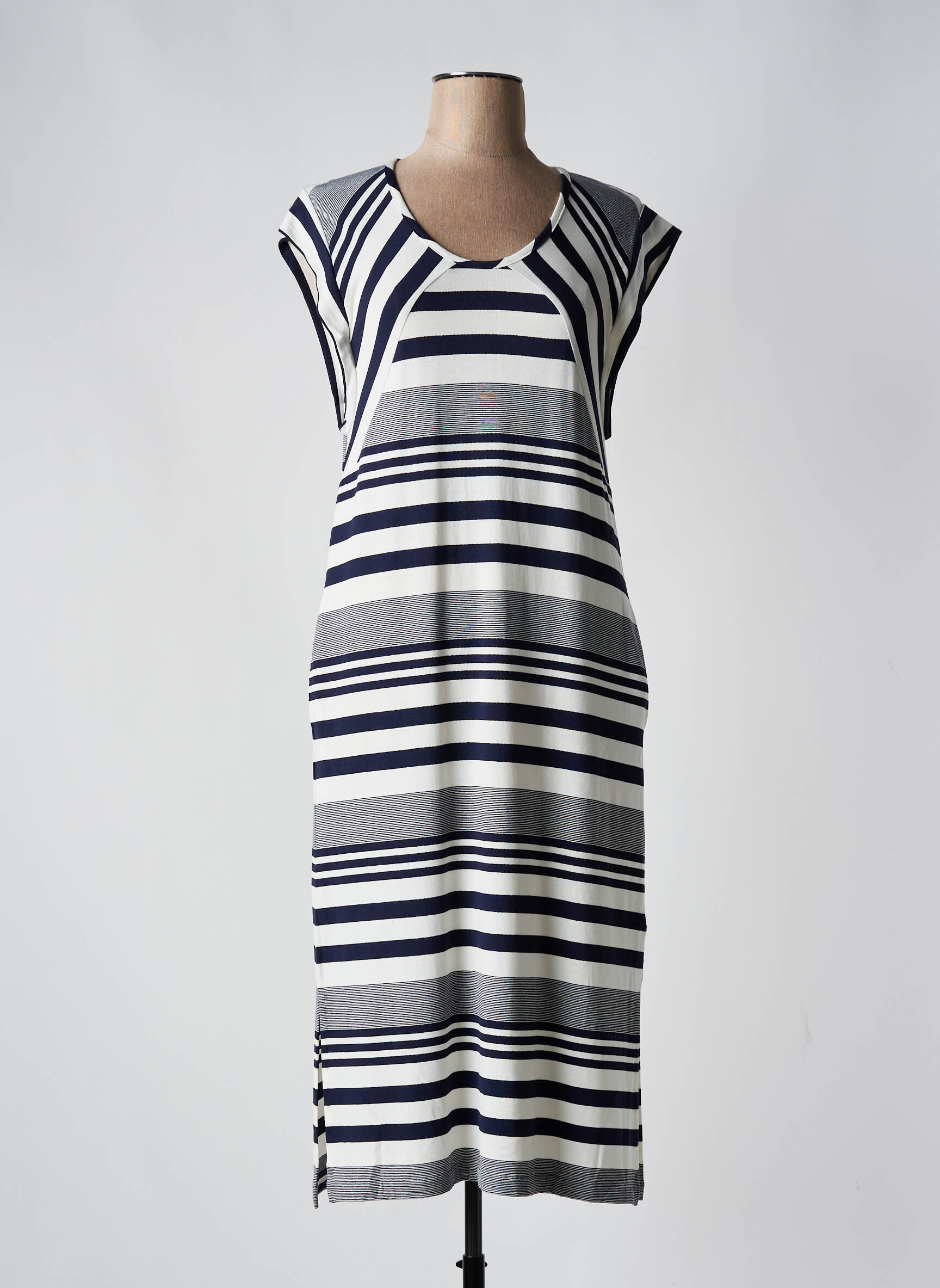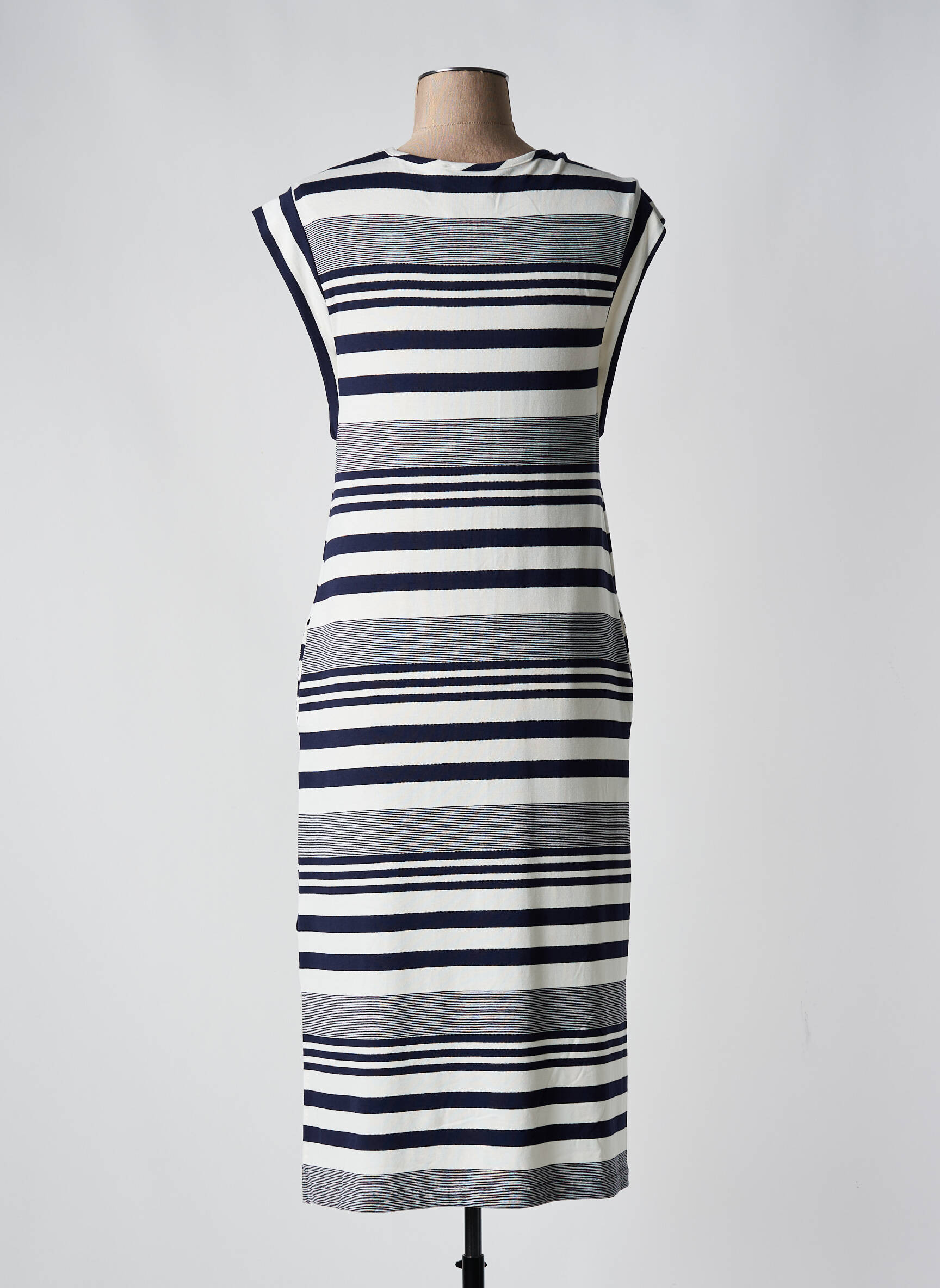 Profitez d’un bon plan mode avec cette robe mi-longue GUITARE pour femme, une pièce élégante à prix doux qui apporte une touche moderne à votre dressing grâce à son motif rayé bleu marine, blanc et gris, sa coupe droite flatteuse et ses petites manches qui en font un choix parfait pour des journées stylées sans se ruiner.