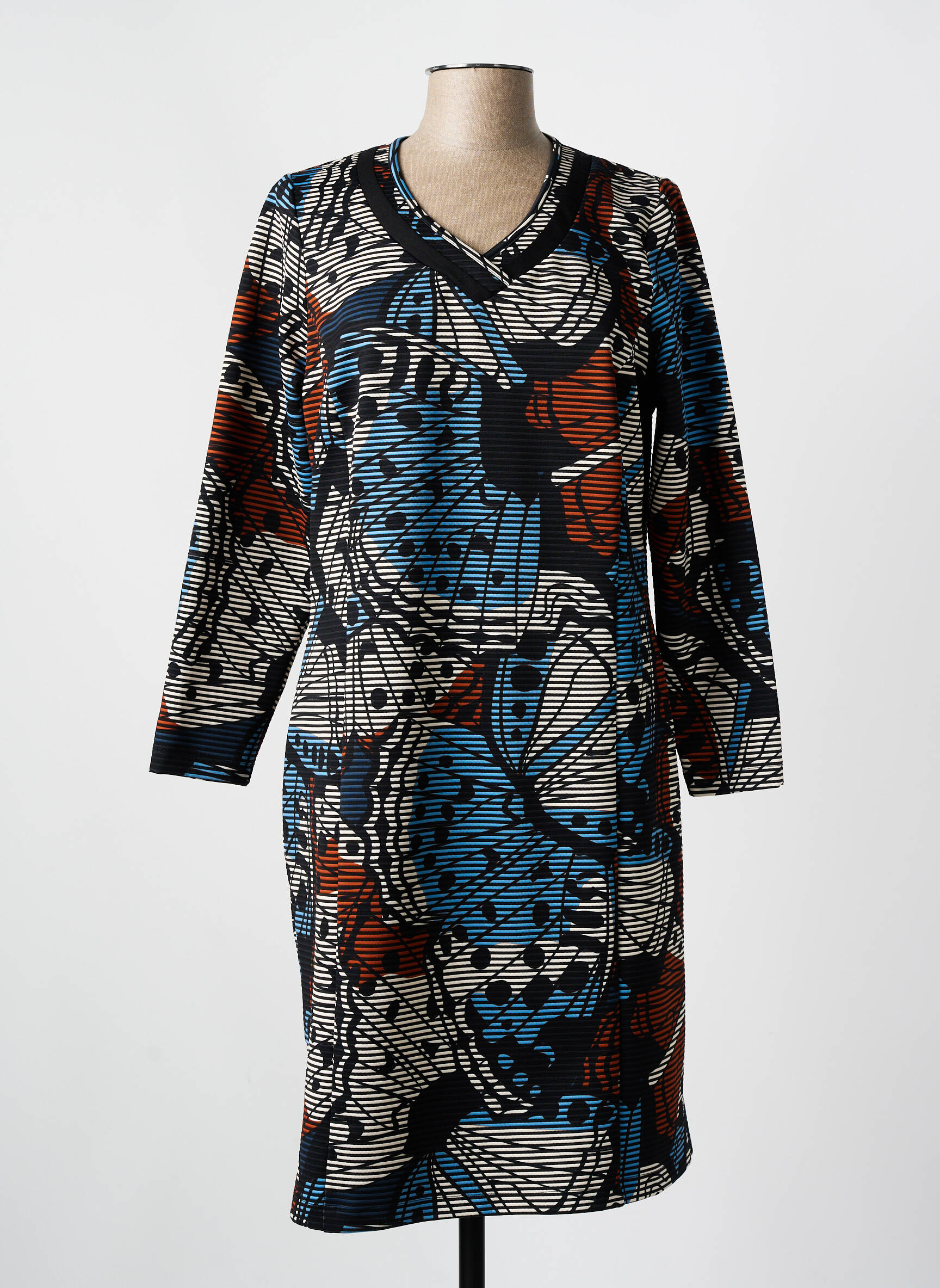 Osez vous détacher des conventions avec cette robe mi-longue signée GUY DUBOUIS, où chaque détail graphique crée un véritable spectacle visuel. Son imprimé audacieux mêle des motifs inspirés de l’ornithologie dans un kaléidoscope de bleus, noirs et touches de rouille, donnant à la robe une allure à la fois moderne et artistique. La coupe droite souligne subtilement la silhouette tout en offrant un confort idéal, et le col en V apporte une note d’élégance discrète qui dévoile délicatement le cou. Les manches longues viennent équilibrer ce design vibrant, assurant une harmonie parfaite entre sophistication et originalité.