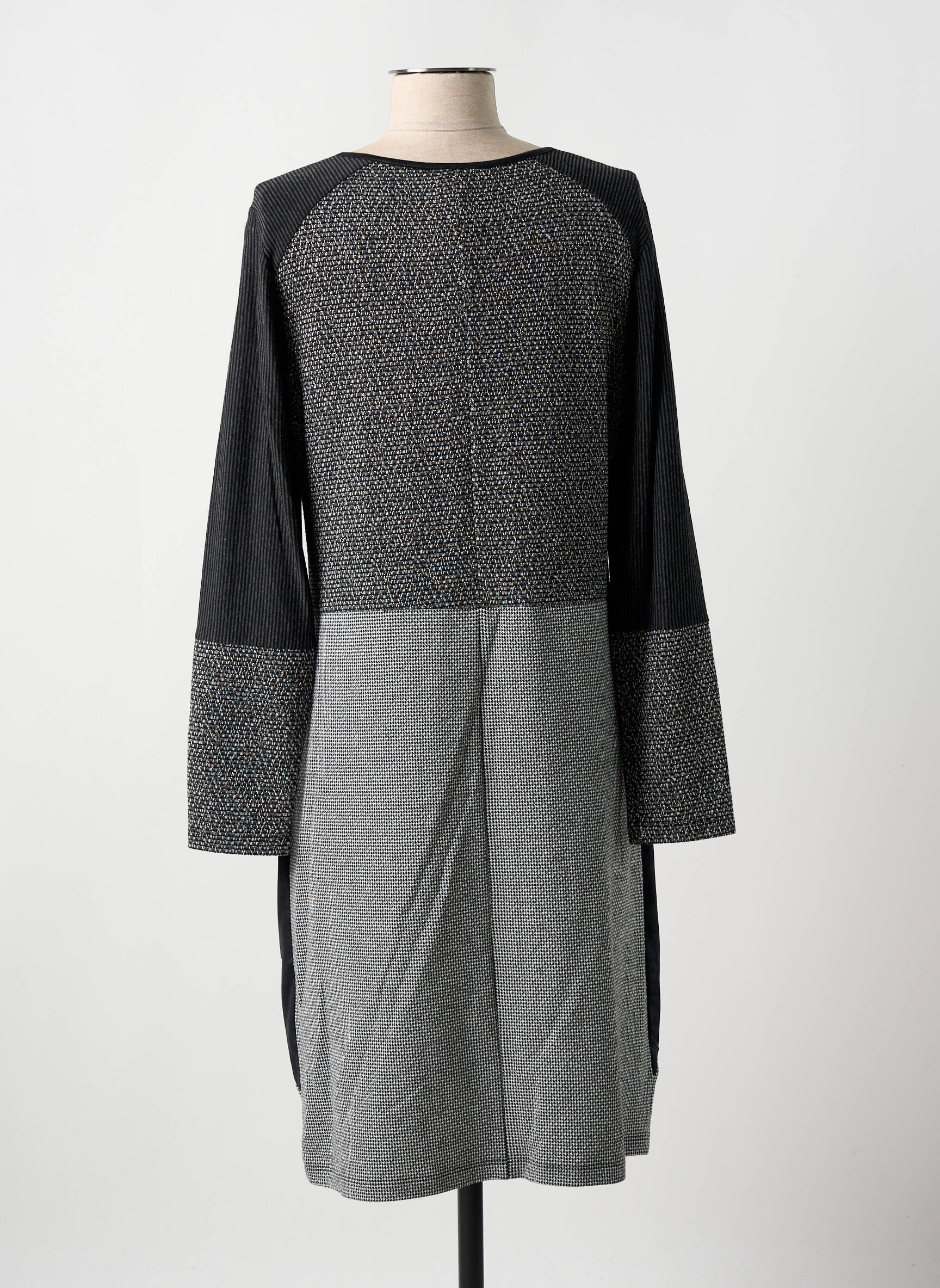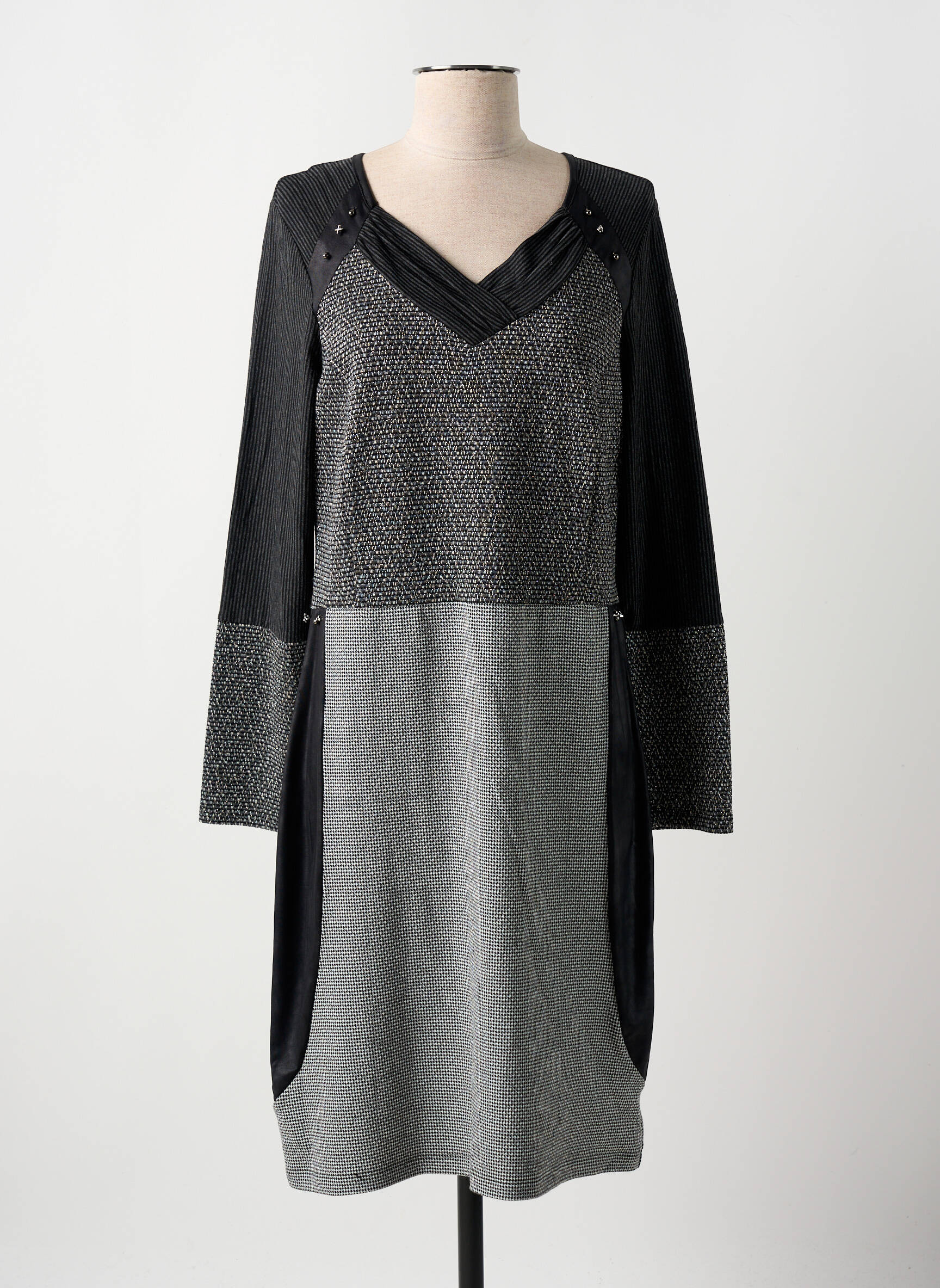 Profitez d’un look chic sans vous ruiner grâce à cette robe mi-longue GUY DUBOUIS pour femme, idéale pour celles qui recherchent une pièce tendance à petit prix. Son jeu d’empiècements graphiques mêlant différentes textures dans des tons gris et noir apporte une touche moderne et élégante à votre tenue, tandis que sa coupe fluide avec col en V assure un tombé flatteur au quotidien. Cette robe est un vrai bon plan qui allie style et économies, parfaite pour sublimer votre garde-robe sans compromis.