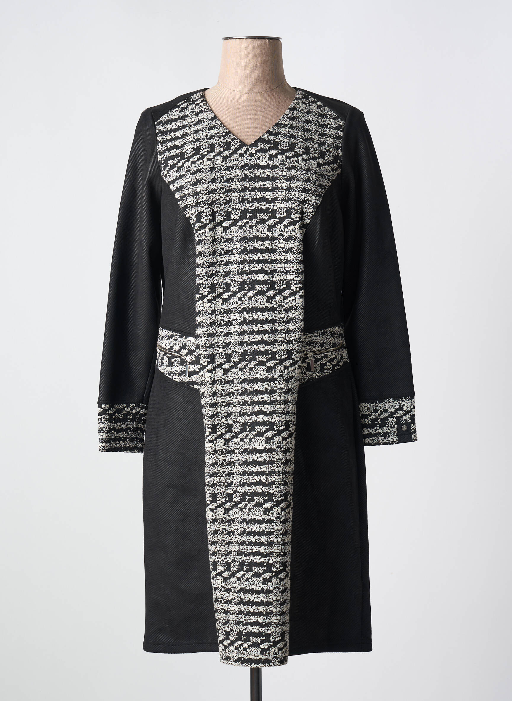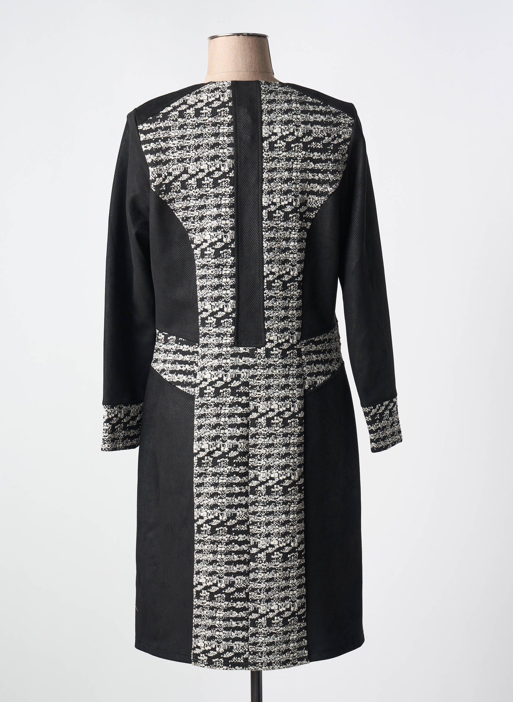 Profitez d'une occasion unique de vous offrir cette robe mi-longue signée GUY DUBOUIS à un prix irrésistible. Avec ses élégants panneaux noirs contrastés par un motif graphique noir et blanc façon tweed sur l'avant, les poignets et la taille, cette robe épouse une coupe droite et met en valeur la silhouette tout en assurant confort et raffinement. C'est le choix idéal pour rehausser votre garde-robe sans vous ruiner grâce à notre sélection à prix cassés.