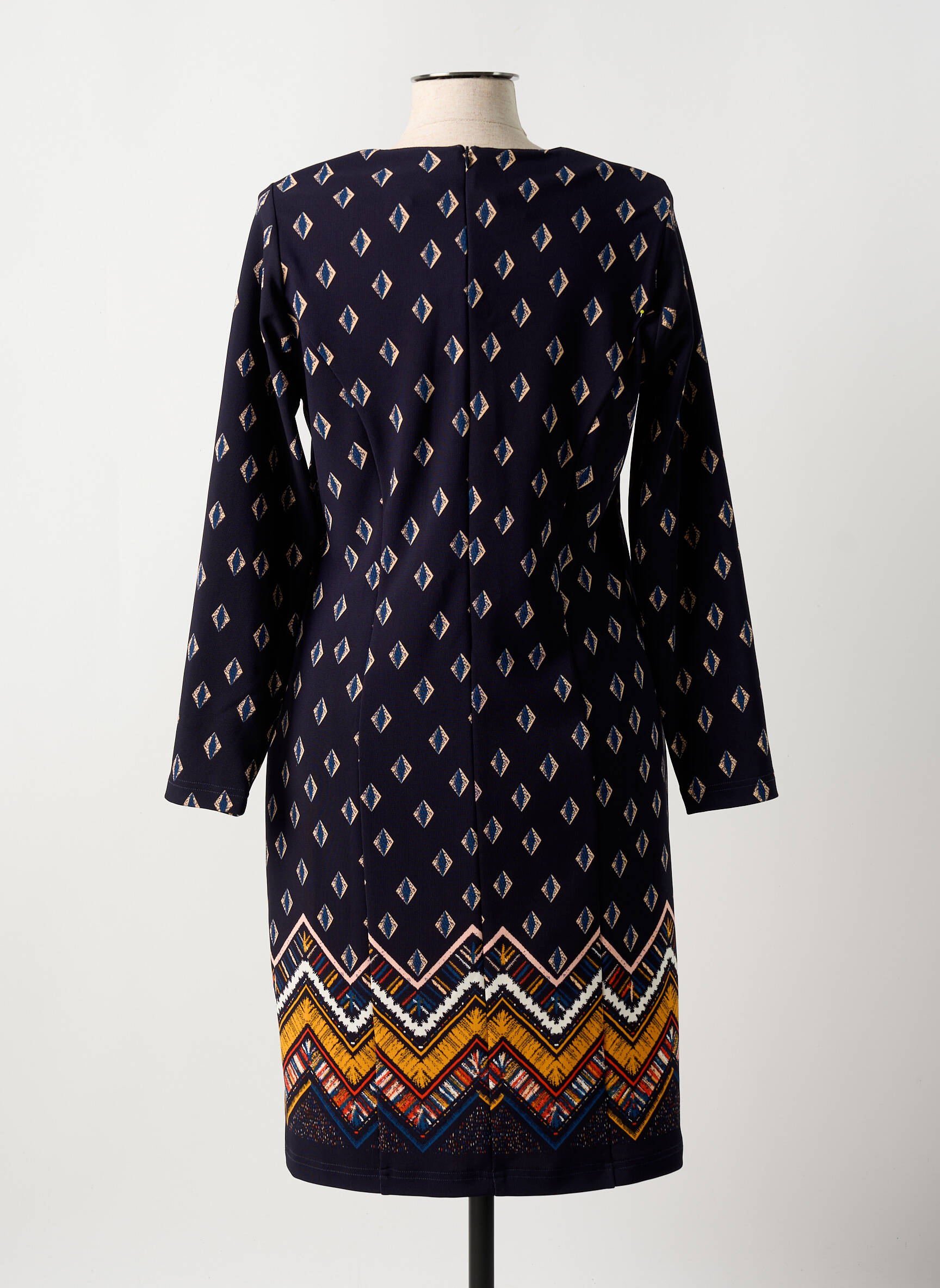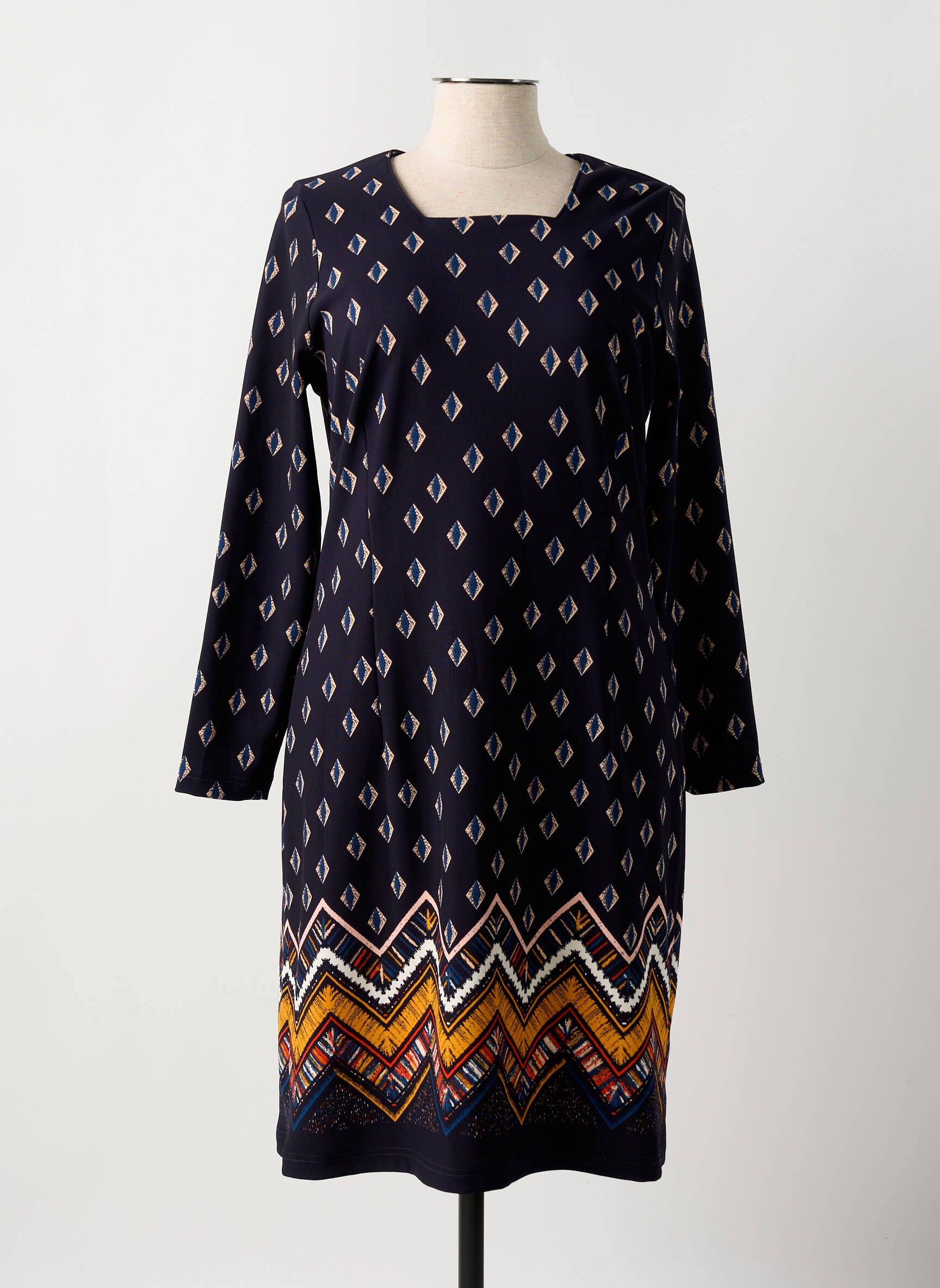 Saisissez l’occasion de faire de vraies économies avec cette robe mi-longue signée GUY DUBOUIS, une pièce tendance et accessible pour renouveler votre garde-robe sans vous ruiner. Son imprimé graphique sur fond bleu marine et ses motifs colorés façon chevrons au bas de la robe apportent une touche d’originalité et du dynamisme à votre tenue, tout en restant élégante avec sa coupe droite confortable et ses manches longues. C’est le choix parfait pour celles qui recherchent l’alliance idéale entre style, confort et bon plan.