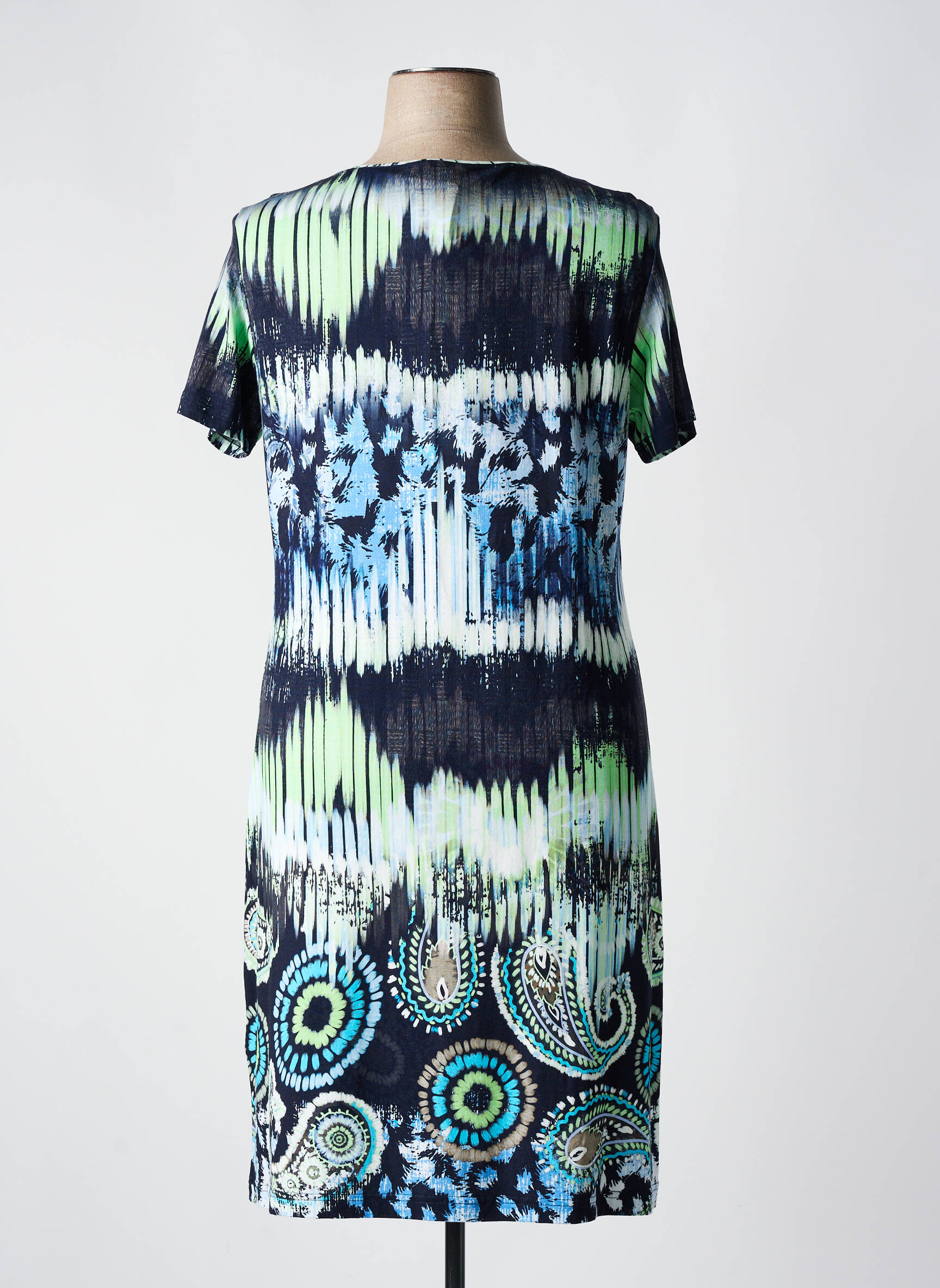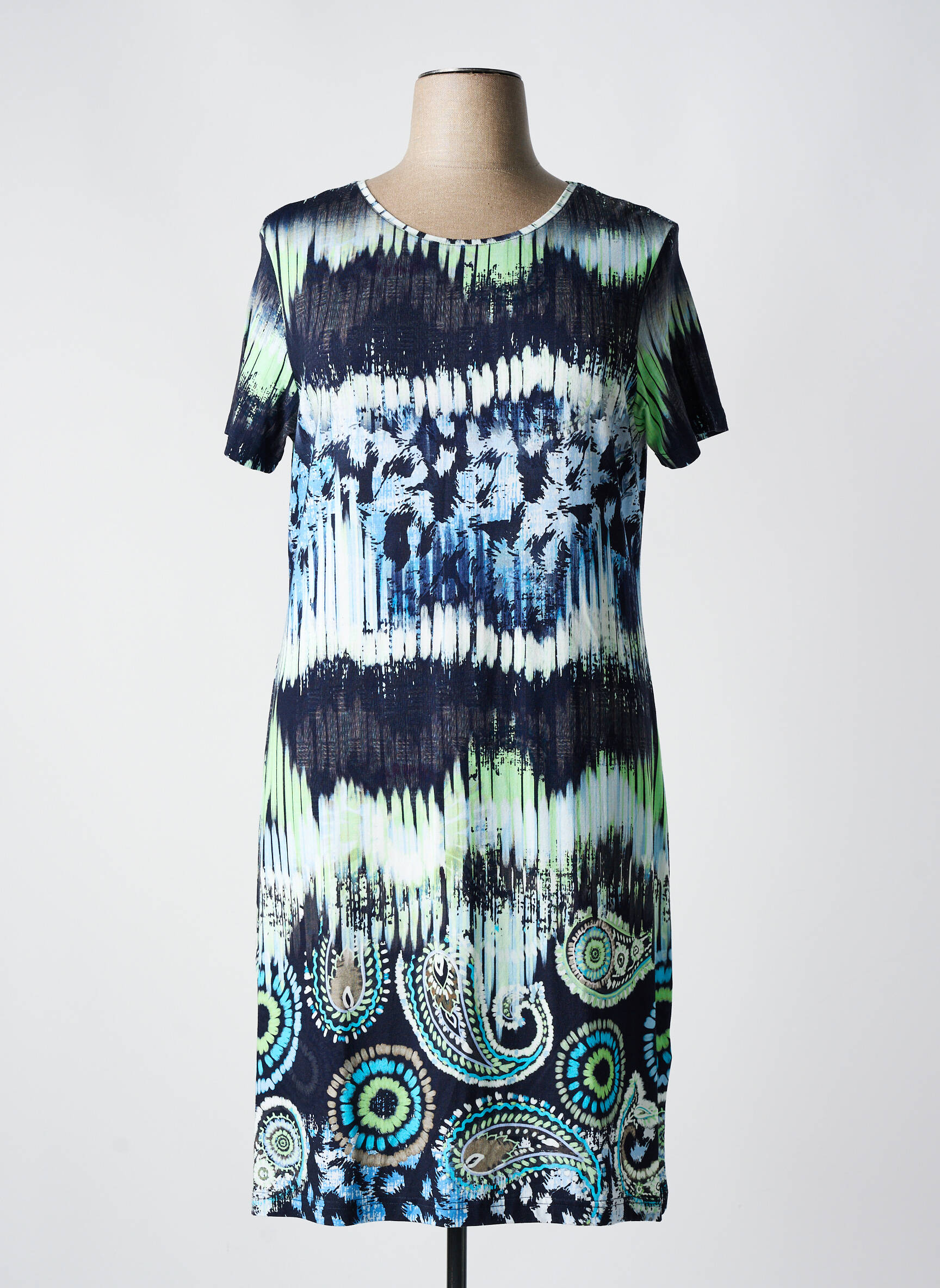 Imaginez une robe capable de capturer l’essence d’un paysage aquatique vibrant, c’est exactement ce que cette robe mi-longue de la marque HAJO vous offre avec son imprimé enchanteur combinant des touches de bleu profond, de vert et de noir qui s’entrelacent en motifs abstraits et paisley, tandis que sa coupe droite aux manches courtes épouse délicatement la silhouette pour un confort élégant au quotidien.