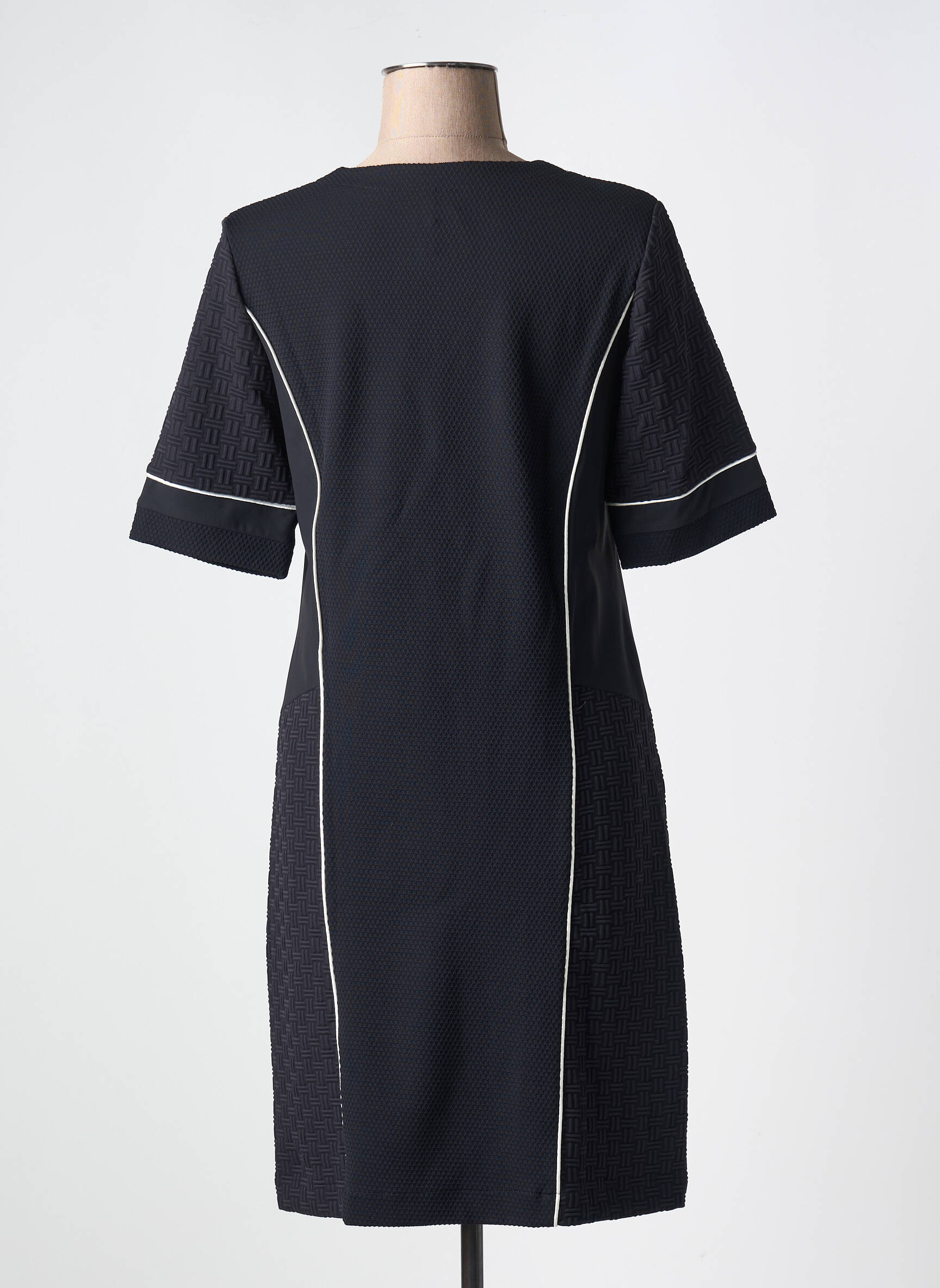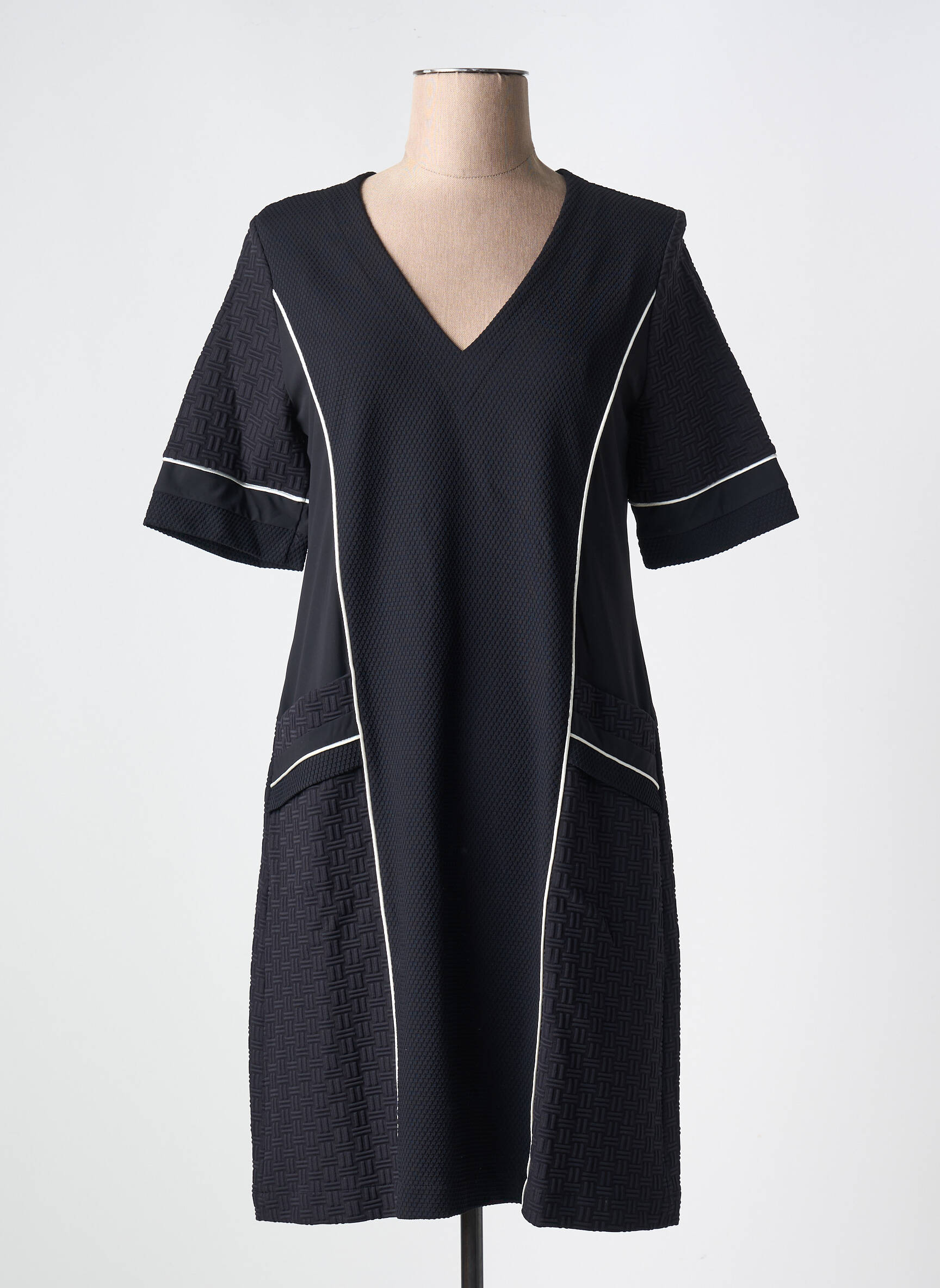 Voici une occasion à saisir pour ajouter une pièce polyvalente et stylée à votre garde-robe sans vous ruiner. Cette robe mi-longue de la marque INDIES séduit par sa coupe droite et son décolleté en V, rehaussée de bandes contrastantes blanches qui soulignent la silhouette avec élégance. Les manches courtes et les poches plaquées apportent une touche moderne tout en garantissant un confort optimal pour toutes vos sorties du quotidien. Profitez de cette offre pour vous offrir une robe chic et intemporelle à petit prix.