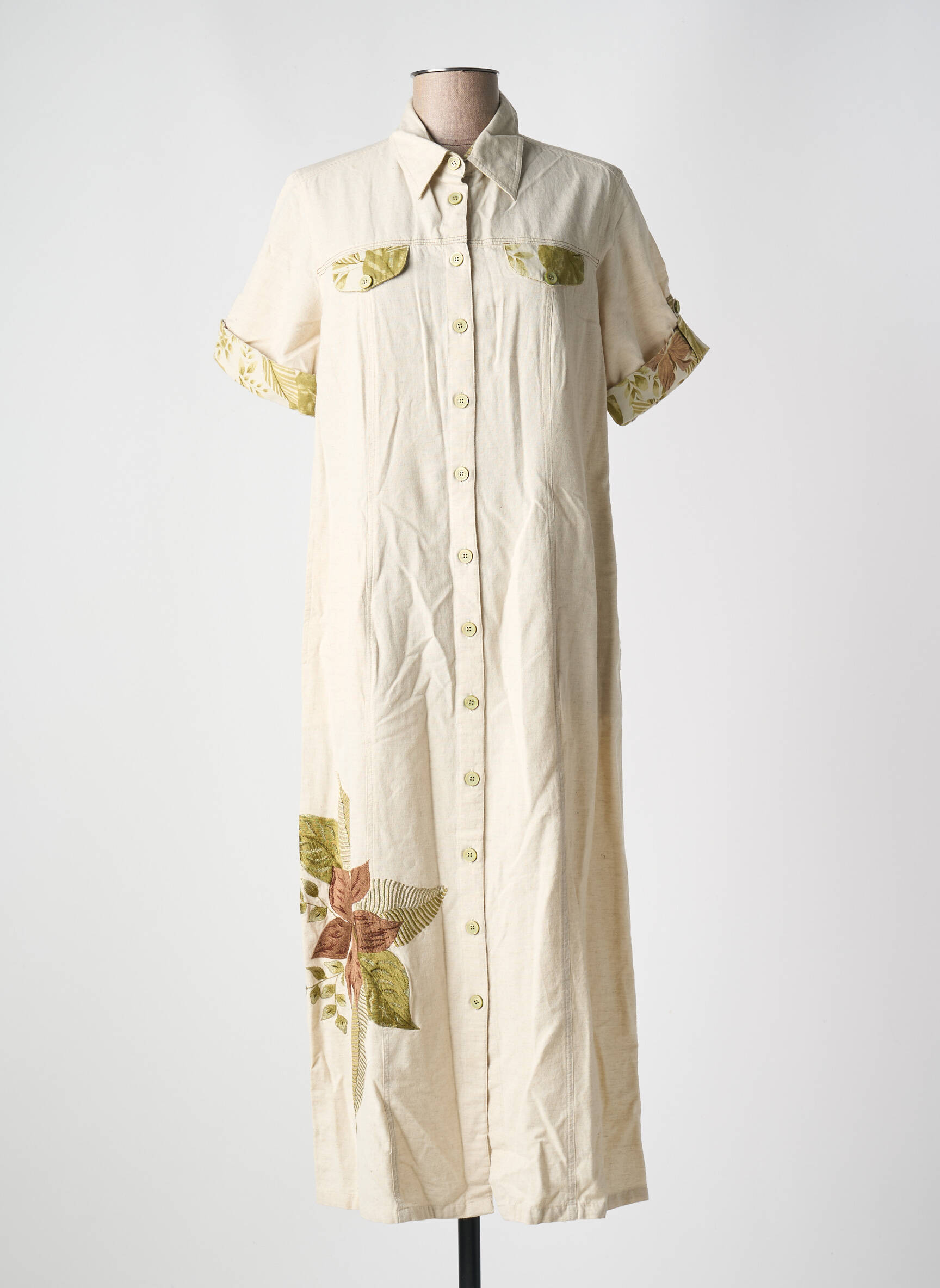 Imaginez porter une robe qui allie à la fois simplicité et originalité avec une douceur naturelle : cette robe mi-longue signée JAC JAC se distingue par sa coupe chemise élégante et décontractée, sublimée par des boutons sur toute la longueur et des manches retroussées qui laissent apparaître un délicat motif floral intérieur. Le jeu subtil de poches poitrine à rabat et la touche d'ornements floraux brodés aux tons terre cuite et verts près de l'ourlet apportent une note de charme rustique et authentique, idéale pour une allure aussi féminine que confortable au quotidien.