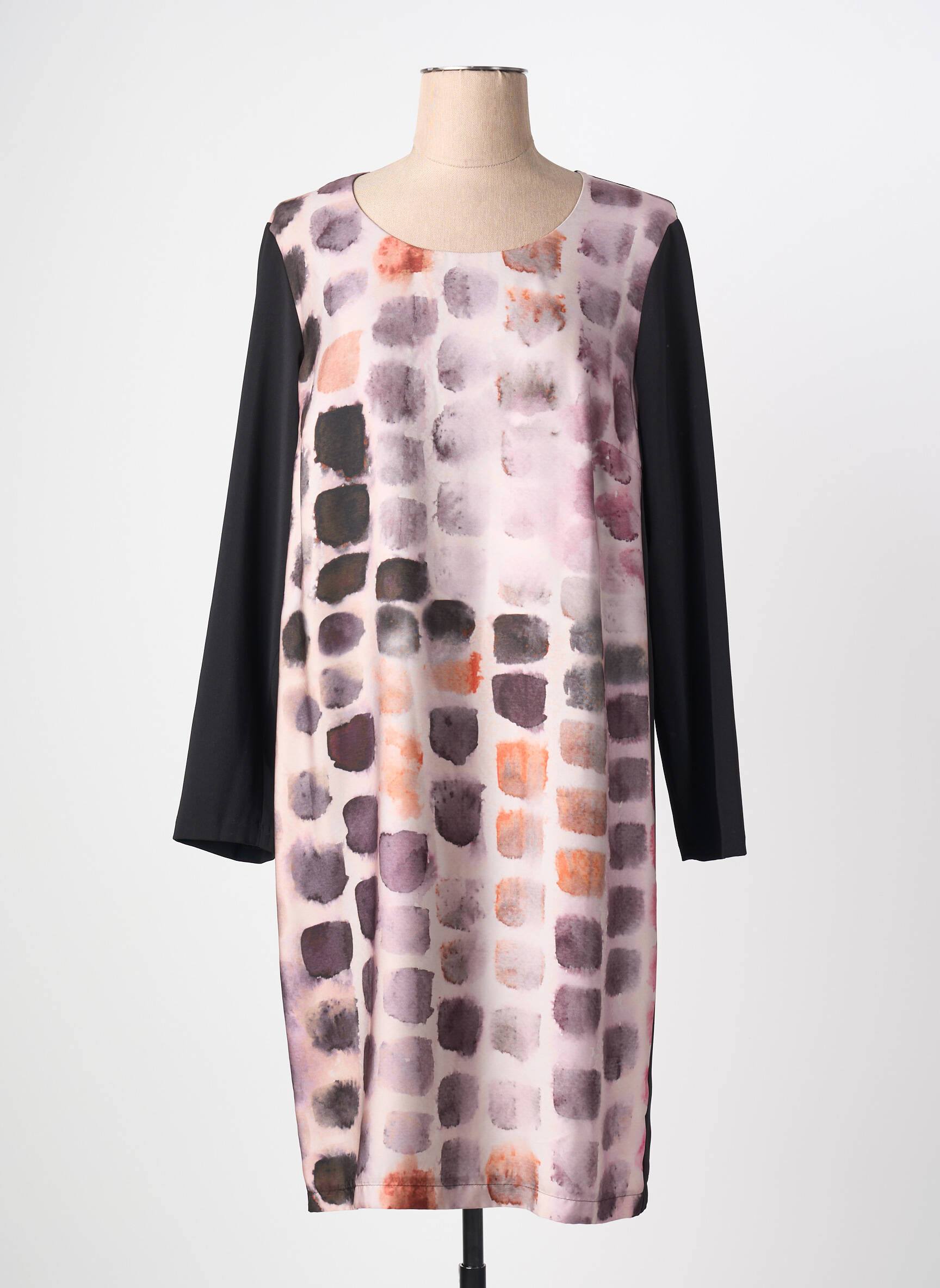 Profitez d'un vrai bon plan avec cette robe mi-longue JEAN DELFIN pour femme, idéale pour apporter une touche d’originalité à petit prix dans votre dressing. Son imprimé graphique aux nuances de mauve, noir et rose attire le regard tout en restant facile à porter, tandis que les manches unies contrastantes allongent la silhouette avec élégance. Cette robe se distingue par son style moderne et décontracté, parfaite pour celles qui cherchent à faire des économies sans sacrifier la tendance.