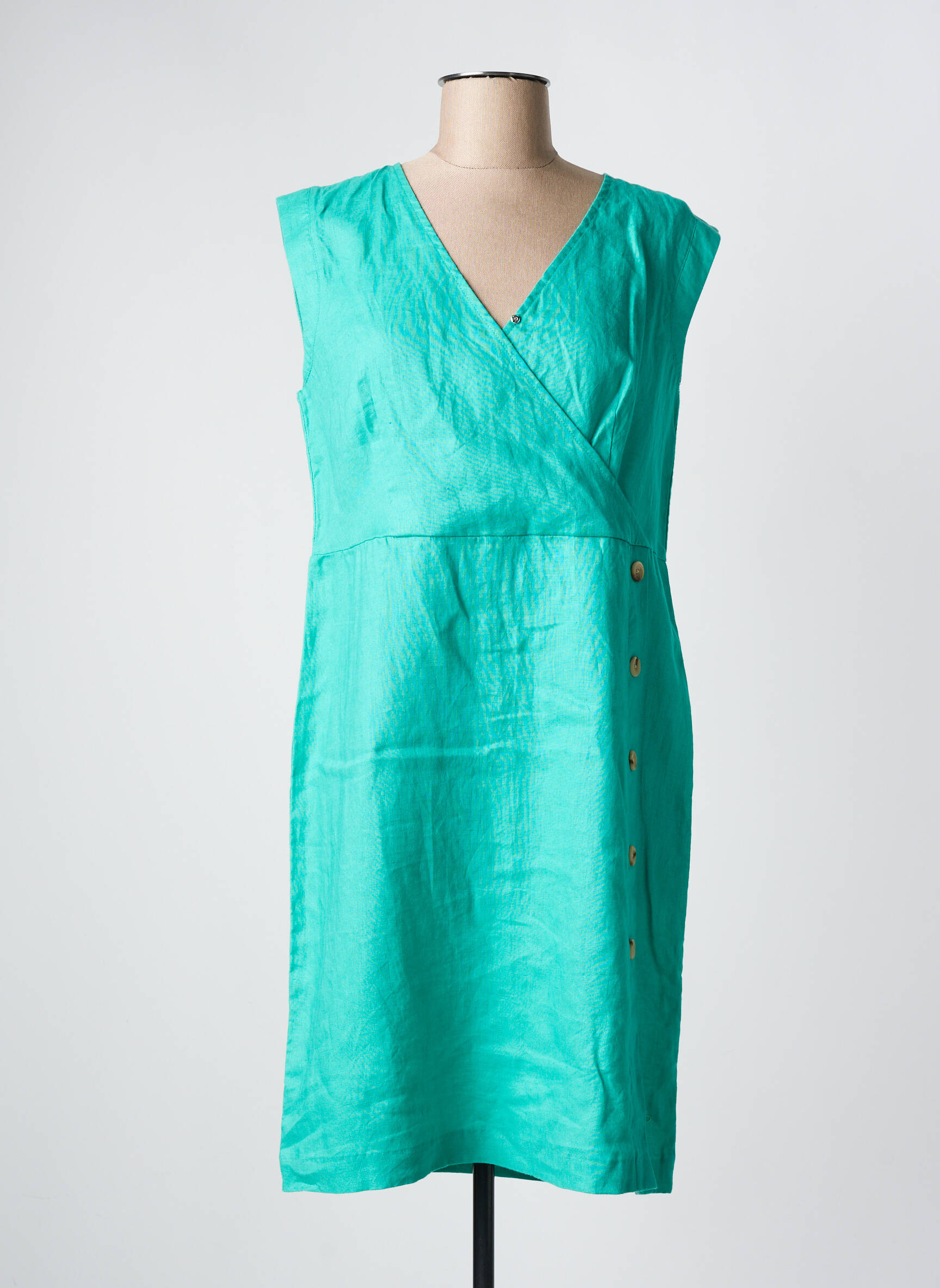 Craquez pour cette robe mi-longue JULIE GUERLANDE à prix tout doux, l'occasion idéale de renouveler votre garde-robe sans vous ruiner. Cette pièce, avec son joli bleu turquoise lumineux et sa coupe portefeuille féminine, séduit par ses boutons décoratifs sur le côté qui apportent une touche d’originalité. Son design sans manches met en valeur la silhouette et promet un confort léger pour la belle saison, parfaite pour toutes vos envies estivales à petit prix.