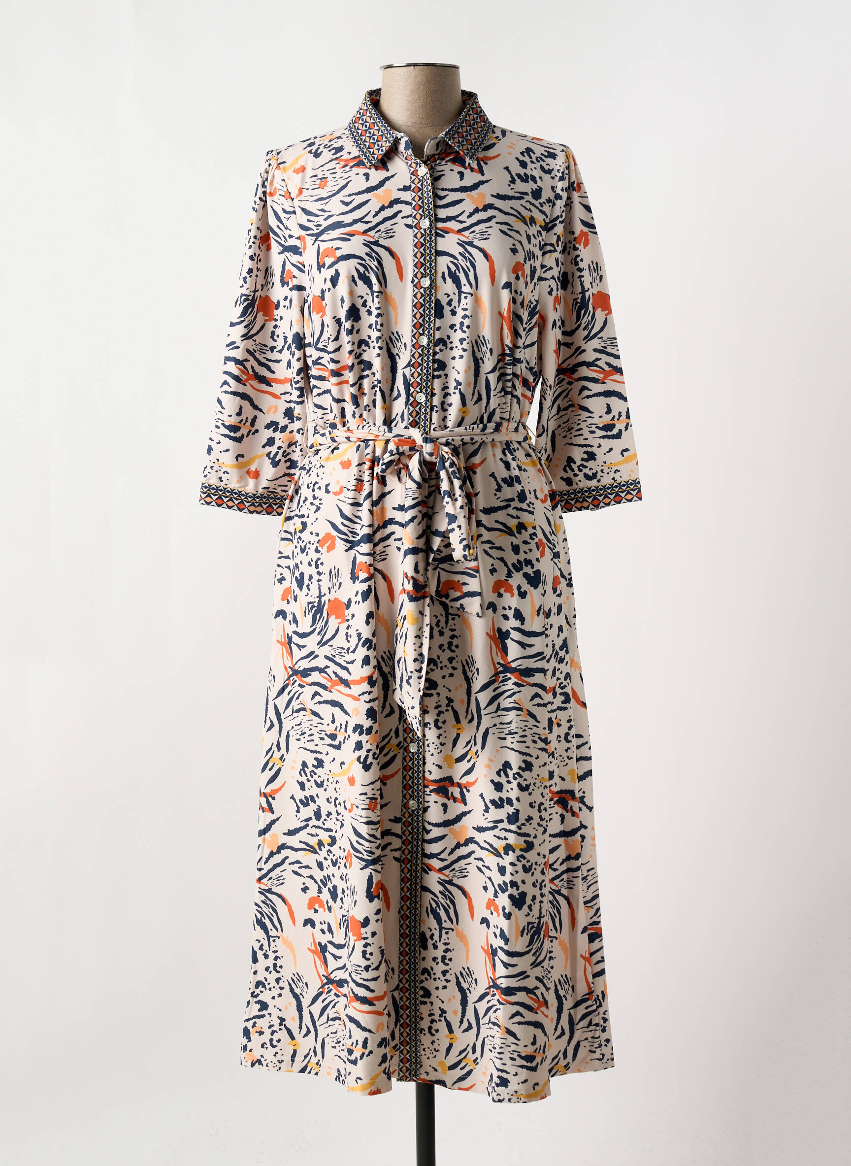 Et si votre robe devenait une véritable œuvre d’art vivante ? Cette robe mi-longue signée K-DESIGN dévoile un imprimé audacieux mêlant des motifs floraux et graphiques aux teintes orange, noir et blanc, s'étirant avec élégance sur une coupe fluide et aérienne. Dotée d’un col chemise classique rehaussé d’un biais contrastant, elle séduit par ses manches trois-quarts et sa ceinture rentrée qui souligne délicatement la taille, offrant une silhouette sophistiquée et contemporaine à la fois.