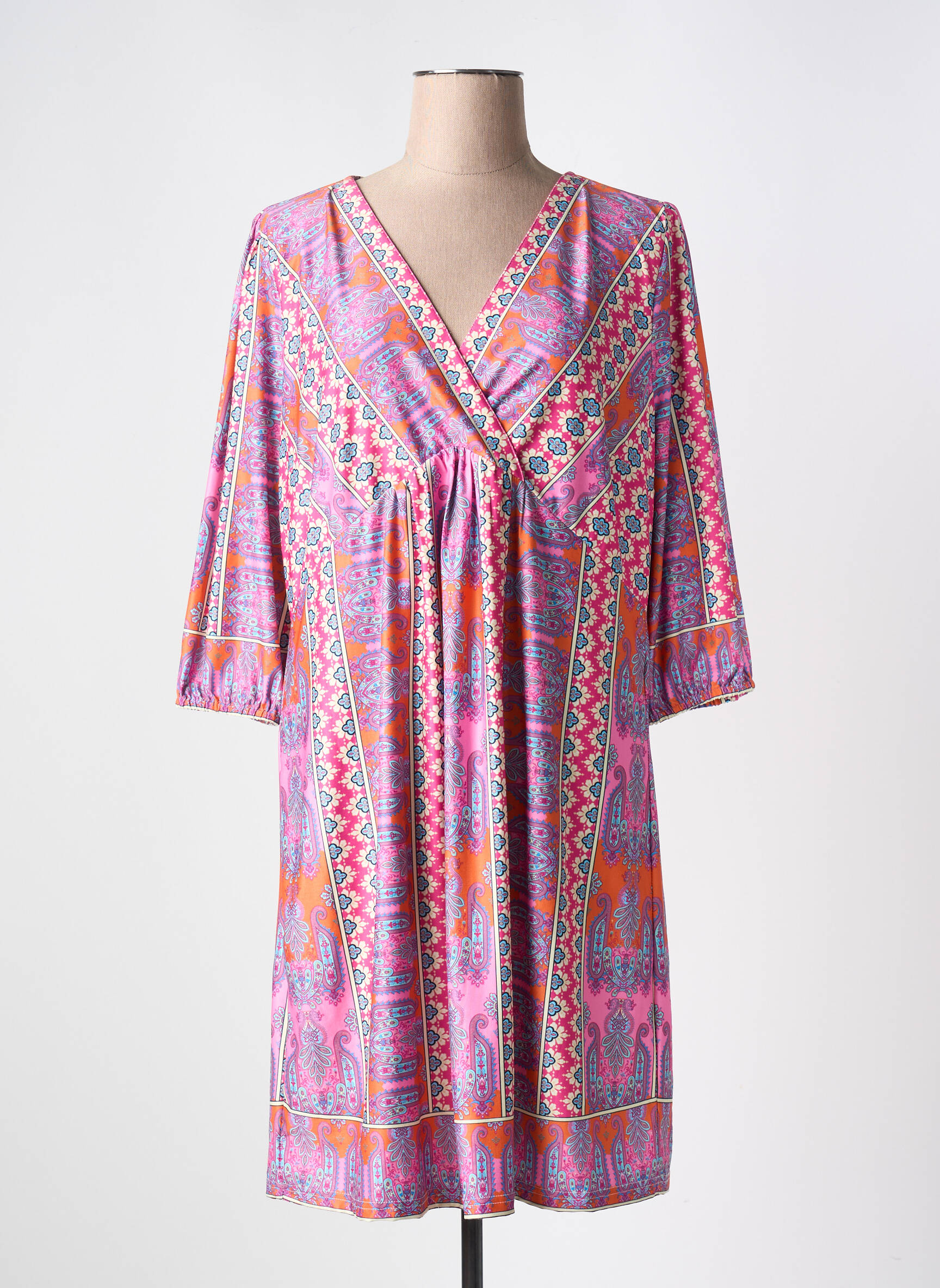 Profitez d’un bon plan mode avec cette robe mi-longue pour femme de la marque K-DESIGN qui allie élégance et petits prix, idéale pour se démarquer sans se ruiner. Son imprimé coloré associe des tons vibrants de rose, d’orange et de violet dans un motif graphique original, complété par des manches trois-quarts et une encolure en V croisée qui mettent en valeur la silhouette tout en offrant un confort optimal. C’est l’option parfaite pour égayer votre dressing à prix tout doux.