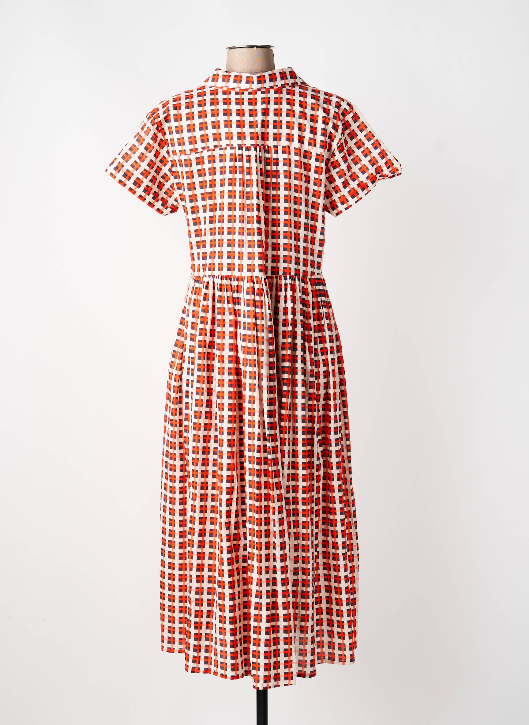 Profitez d’un vrai bon plan avec cette robe mi-longue KALI YOG pour femme, idéale pour donner du pep’s à toutes vos tenues estivales sans vous ruiner. Son imprimé graphique à carreaux orange et blanc apporte une touche de fraîcheur et de modernité, tandis que sa coupe fluide et confortable flatte la silhouette en toute légèreté. Dotée d’un col chemise élégant et de manches courtes, elle se porte aussi bien en journée qu’en soirée et s’impose comme l’alliée incontournable des looks chics à prix doux.