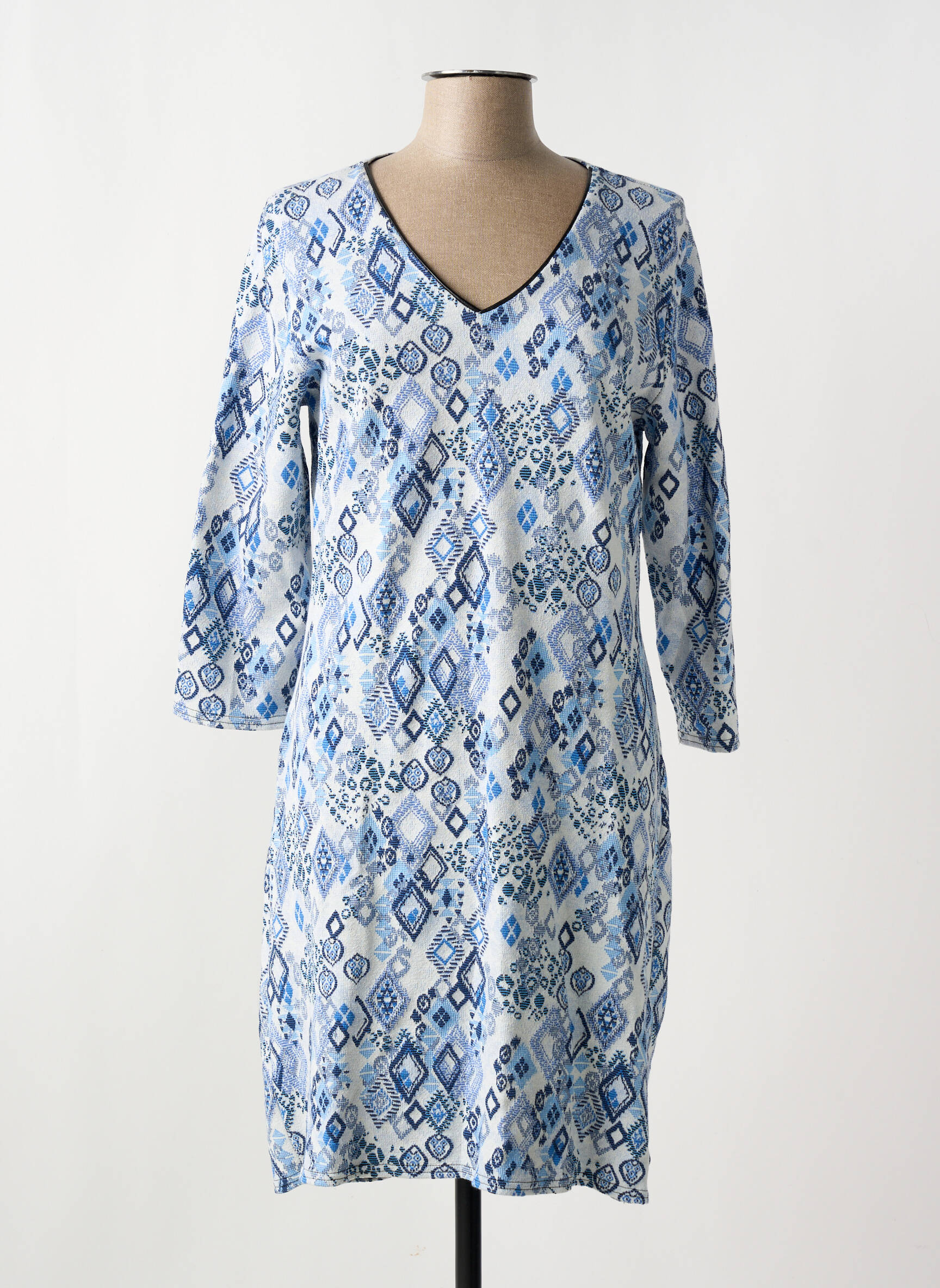 Craquez pour cette robe mi-longue signée LE SINGE DE JULIE, idéale pour celles qui veulent renouveler leur garde-robe sans se ruiner. Son imprimé géométrique bleu et blanc apporte une touche de fraîcheur et de modernité à toutes vos tenues quotidiennes, tandis que sa coupe fluide et son encolure en V garantissent un confort optimal. Profitez d’un bon plan irrésistible pour vous offrir un look chic et décontracté à petit prix.