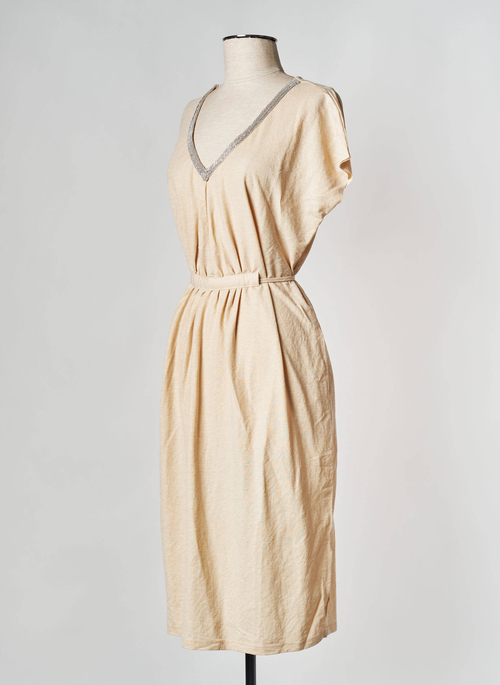 Imaginez une robe qui capture la douceur d’un après-midi ensoleillé avec une simplicité élégante : cette robe mi-longue signée LILI SIDONIO pour femme déploie une coupe fluide où un délicat beige lumineux se mêle à une encolure en V bordée d’un fin liseré gris qui souligne subtilement le décolleté. Les manches courtes tombent avec naturel, tandis que la taille élastiquée offre une silhouette ajustée mais confortable, révélant une allure à la fois décontractée et raffinée, idéale pour une journée où le chic rencontre la simplicité.