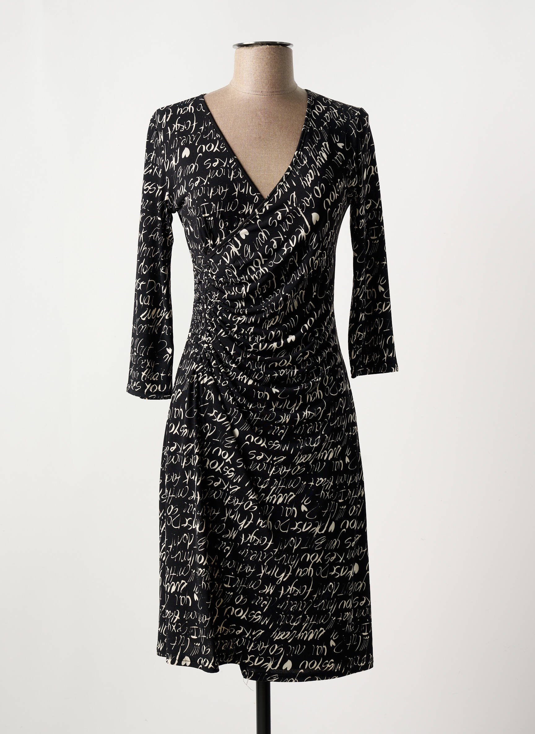 Profitez d’un vrai bon plan mode avec cette robe mi-longue de la marque LILOO, au style chic et moderne pour un prix tout doux. Son imprimé original façon écriture sur fond noir sublime la silhouette grâce à une coupe portefeuille avec un joli décolleté croisé et des manches trois-quarts. Cette pièce tendance allie allure élégante et confort pour toutes vos occasions sans vous ruiner.