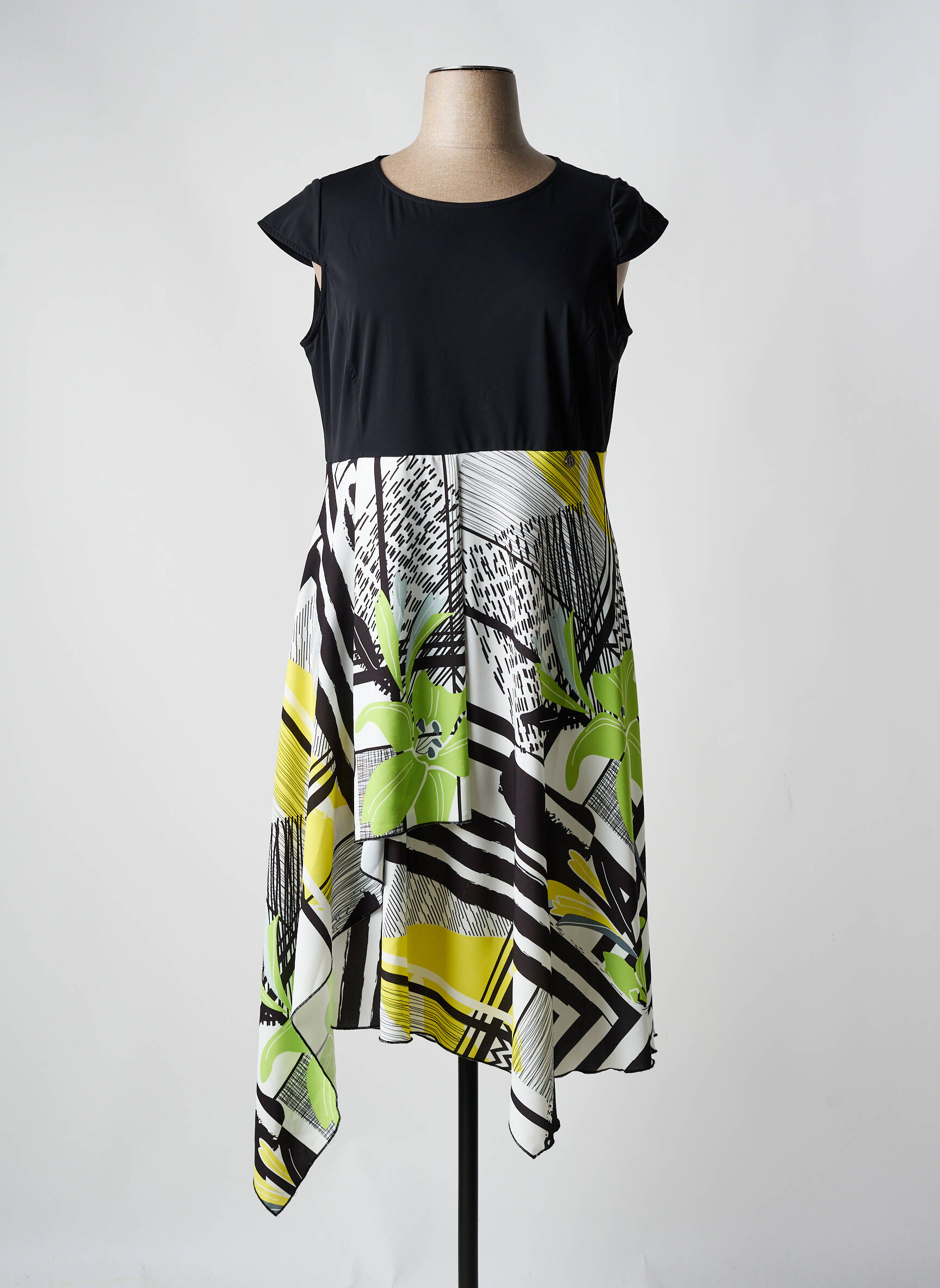 Saisissez l’occasion de renouveler votre dressing avec cette robe mi-longue MALOKA à prix tout doux, un vrai bon plan pour allier style et économies. Ce modèle pour femme séduit par son buste uni noir à petites manches, contrastant élégamment avec une jupe fluide à motifs graphiques et floraux dans les tons vert anis, noir et blanc. Sa coupe asymétrique apporte une touche d’originalité tandis que les lignes flatteuses et l’imprimé vibrant mettent en valeur la silhouette. C’est la robe idéale pour se démarquer au quotidien sans se ruiner.