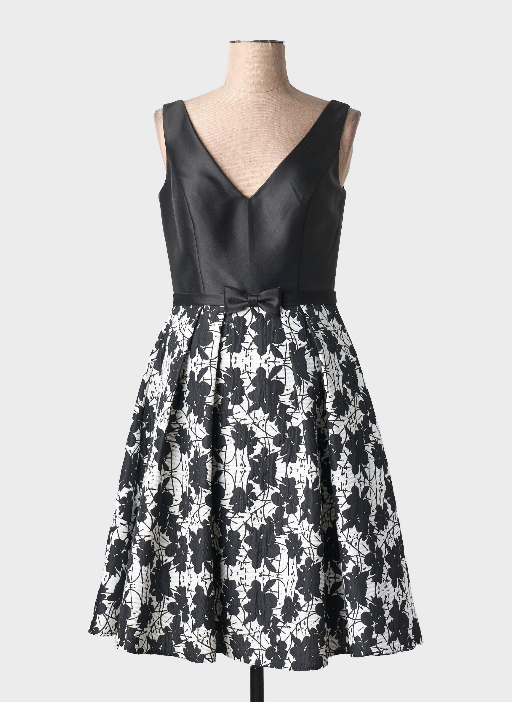 Profitez d’une occasion unique de vous offrir une robe mi-longue MARFIL à prix tout doux, idéale pour sublimer toutes vos sorties élégantes. Son haut noir à encolure en V apporte une touche de raffinement moderne, tandis que la jupe évasée à imprimé floral noir et blanc joue la carte du chic intemporel, le tout rehaussé d’un petit nœud délicat à la taille pour une silhouette féminine incomparable sans vous ruiner.