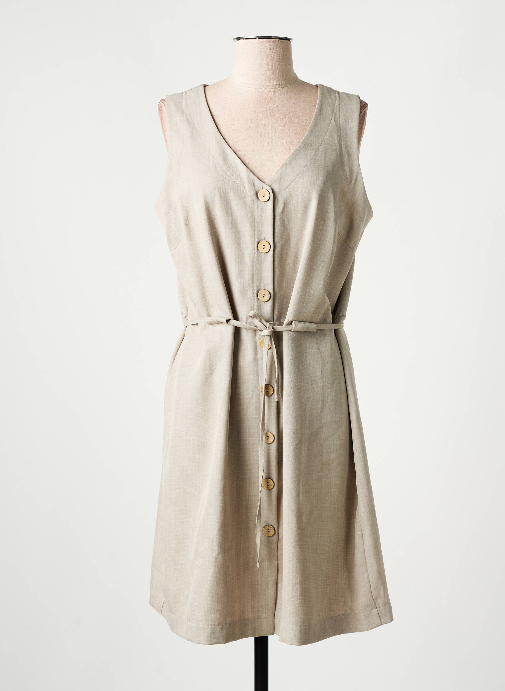 Profitez d’un vrai bon plan avec cette robe mi-longue pour femme de la marque MASSANA, proposée à prix tout doux pour renouveler votre garde-robe sans vous ruiner. Sa coupe sans manches et son joli décolleté en V apportent une touche de légèreté idéale pour les beaux jours, tandis que sa rangée de boutons effet bois et sa ceinture fine à la taille soulignent subtilement la silhouette. Son coloris naturel et son tissu agréable offrent une allure simple, élégante et facile à porter au quotidien comme en vacances.