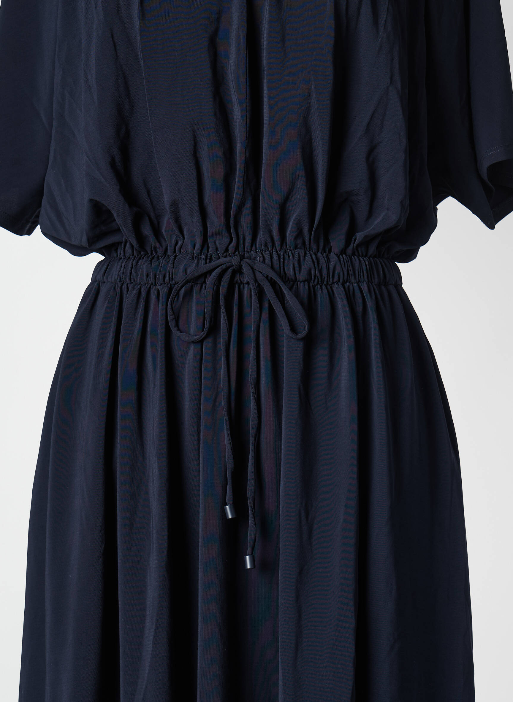 Comme une brise légère qui apporte élégance et simplicité, cette robe mi-longue Max Mara en un bleu profond enveloppe la silhouette avec douceur grâce à sa taille cintrée par un cordon ajustable, tandis que ses manches amples tombent délicatement en volant fluides, apportant une allure à la fois sobre et sophistiquée, idéale pour accompagner aussi bien une journée décontractée qu’une soirée raffinée.