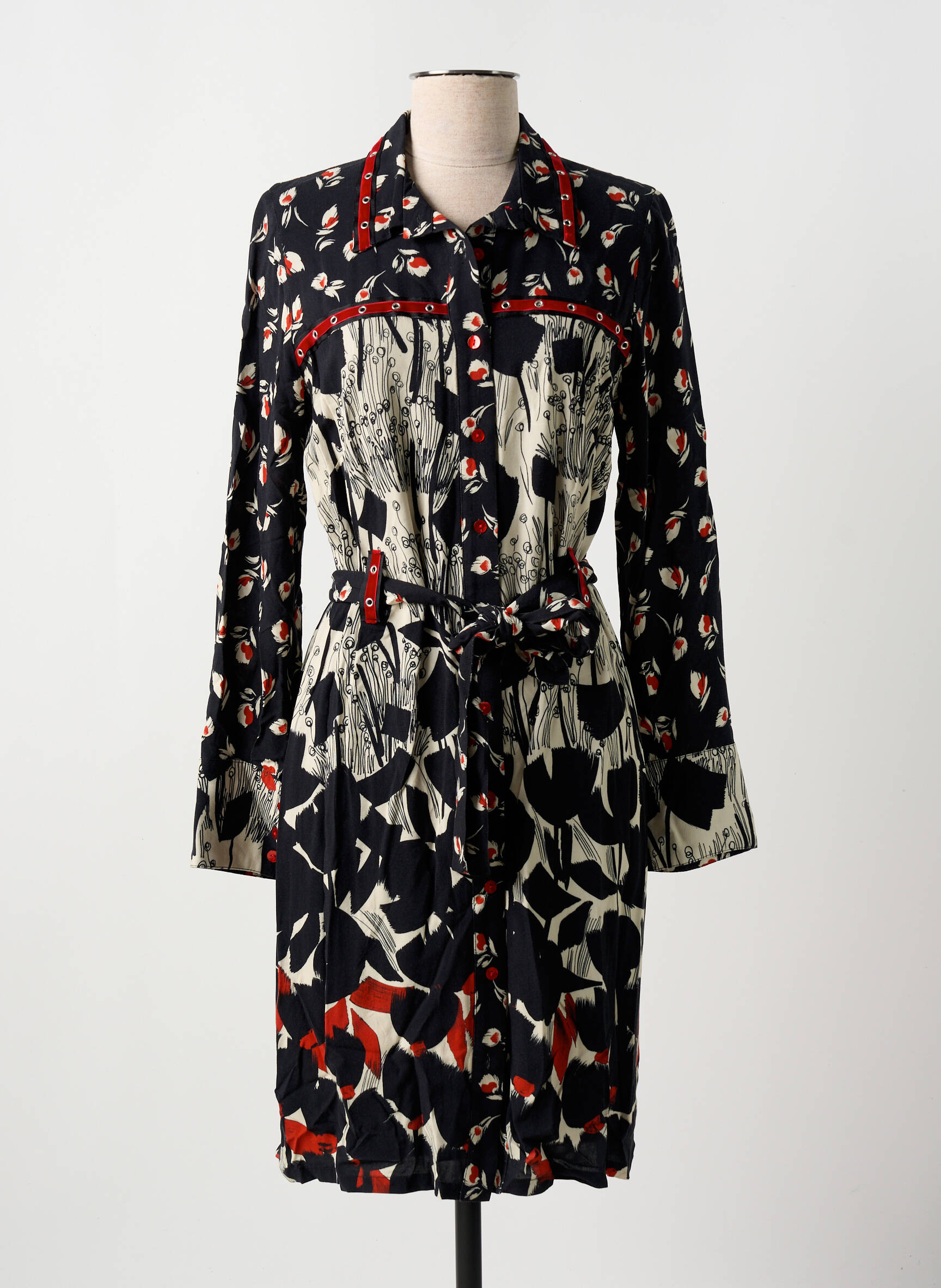 Succombez à la tentation d’une robe mi-longue MERI & ESCA à prix mini, parfaite pour allier style et économie sans compromis. Cette robe séduit par son imprimé graphique mêlant noir, blanc et touches de rouge, son col chemise classique et sa coupe ceinturée flatte la silhouette tout en offrant un confort au quotidien. C’est l’opportunité idéale de vous offrir un look chic et original à petit prix, sans renoncer à la qualité boutique.