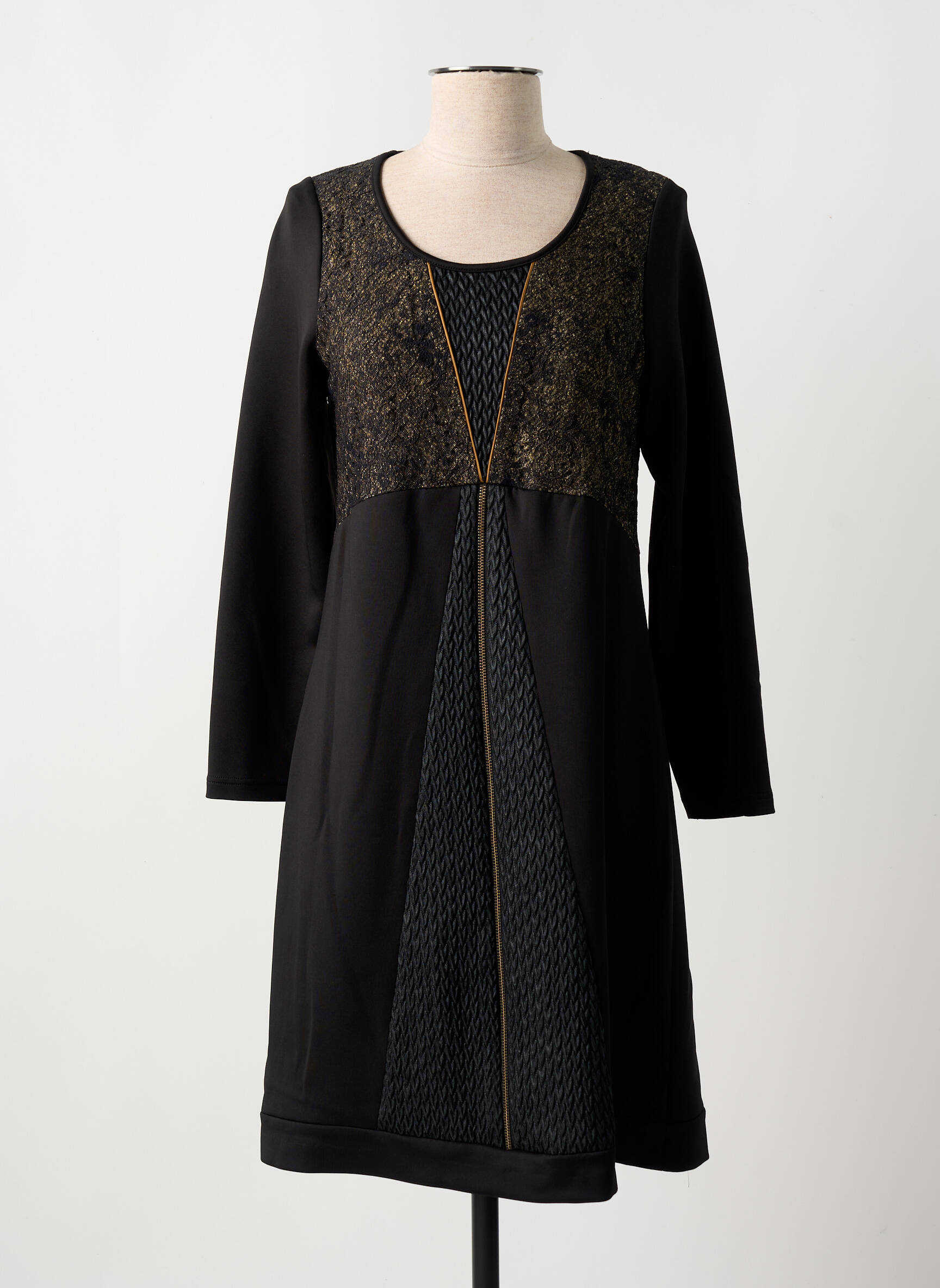 Profitez d’une vraie occasion mode avec cette robe mi-longue MERI & ESCA pour femme, parfaite pour allier élégance et petit prix. On craque pour son jeu de matières au niveau du buste et sa jolie incrustation de motifs texturés sur le devant, subtilement rehaussée par un liseré doré qui structure la silhouette. Ses manches longues et sa coupe fluide offrent confort et féminité en toutes circonstances, idéal pour vous démarquer sans vous ruiner.