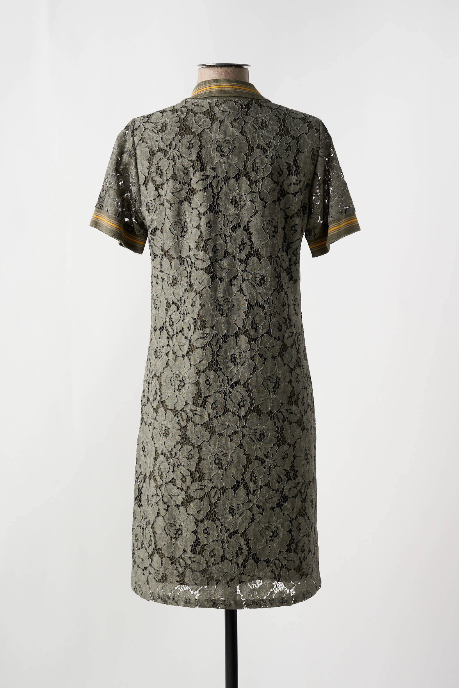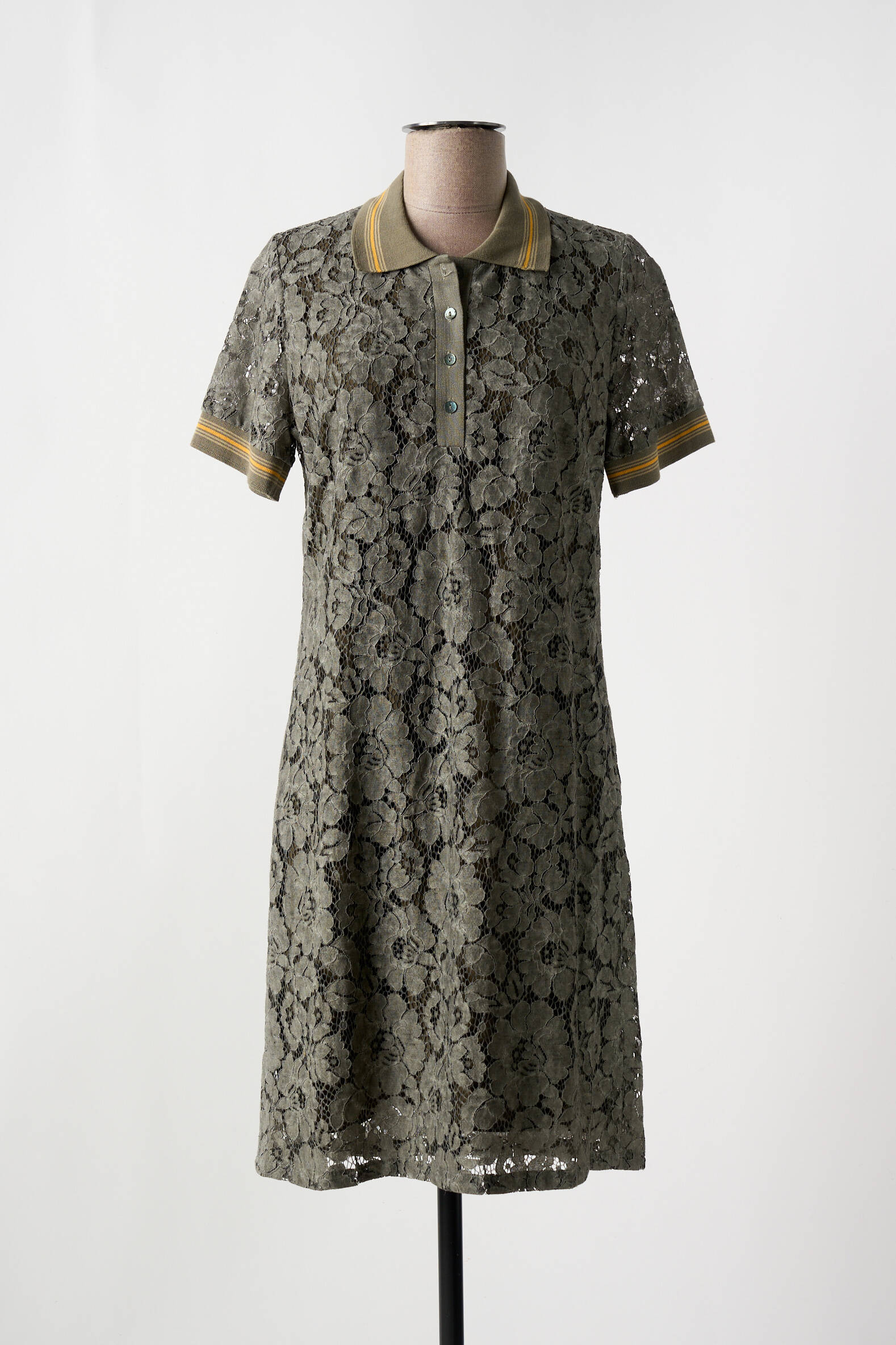 Imaginez une robe qui allie à la fois la délicatesse d’une dentelle florale et le style intemporel d’un polo pour réinventer votre garde-robe avec élégance. Cette robe mi-longue de MERI & ESCA pour femme présente une structure en dentelle kaki aux motifs floraux sophistiqués, soulignée par un col polo à rayures jaunes et kaki qui apporte une touche sportive raffinée, tandis que ses manches courtes délicatement finies rappellent ce jeu de matière et de couleurs, pour un look à la fois chic et décontracté qui s’adapte parfaitement à toutes vos occasions.
